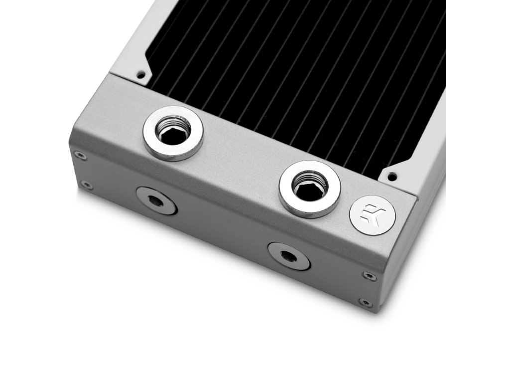 Každá strana radiátora je vybavenádva porty G1/4" na. To znamená, že si môžete slobodne vybrať, ako chcete svoju slučku prevádzkovať. To zaručujedodatočná flexibilitapretože môžete použiťEK-Quantum Surface možno ľahko integrovať aj do budúcich zostáv.Okremštyri G1/4-palcové prípojky stále mátejeden dodatočný port G1/4-palcov k dispozícii,pomocou ktorých môžete ľahko vyprázdniť, vyprázdniť alebo naplniť slučku môže. Nachádza sa tiež na konci chladiča a umožňuje vám jednoduchú údržbu systému.