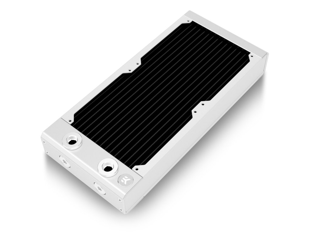 StajňaHliníkové koncovky s kontrastným strieborným povrchom dodať chladiču vysokokvalitný vzhľad. Pre povrchovú úpravu robustných oceľových bočných častíVodné bloky EK na odolnú pololesklú bielu farbu. Samotné lamely sú natreté matnou čiernou farbou s vysokým súčiniteľom tepelnej vodivosti.Vďaka dodaným skrutkám je tento chladič kompatibilný so 120 mm ventilátormi, ktoré majú štandardnú hrúbku 25 mm.