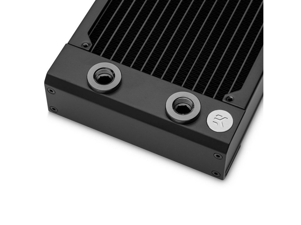 StajňaHliníkové koncovky s čiernym povrchom dodať chladiču vysokokvalitný vzhľad. Pre povrchovú úpravu robustných oceľových bočných častíVodné bloky EK na odolnú pololesklú čiernu farbu. Samotné lamely sú natreté matnou čiernou farbou s vysokým súčiniteľom tepelnej vodivosti.Vďaka dodaným skrutkám je tento chladič kompatibilný so 120 mm ventilátormi, ktoré majú štandardnú hrúbku 25 mm.