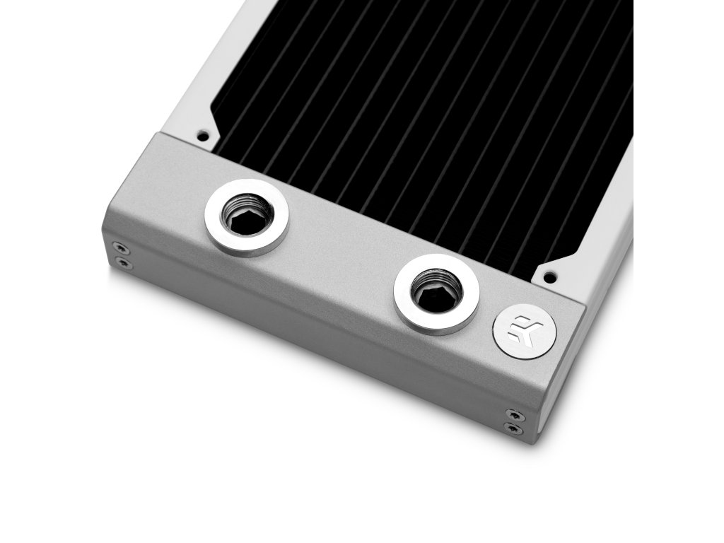StajňaHliníkové koncovky s kontrastným strieborným povrchom dodať chladiču vysokokvalitný vzhľad. Pre povrchovú úpravu robustných bočných panelov z nehrdzavejúcej oceleVodné bloky EK na odolnú pololesklú farbu. Samotné lamely sú natreté matnou čiernou farbou s vysokým súčiniteľom tepelnej vodivosti.Technické údaje