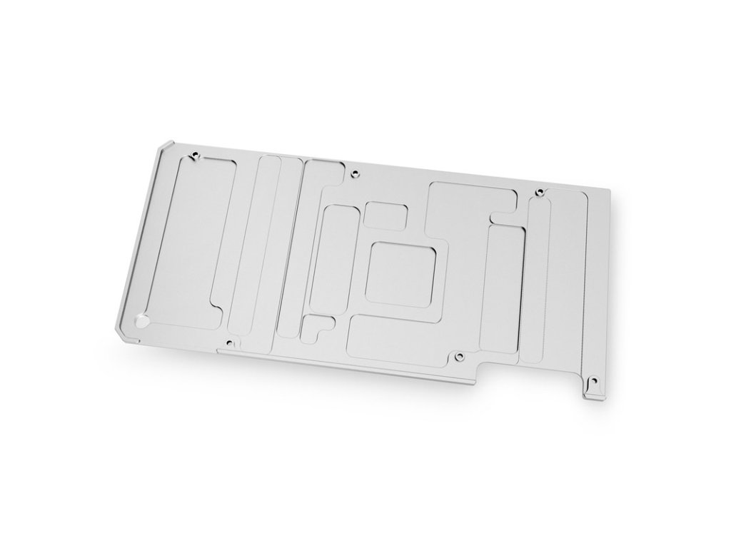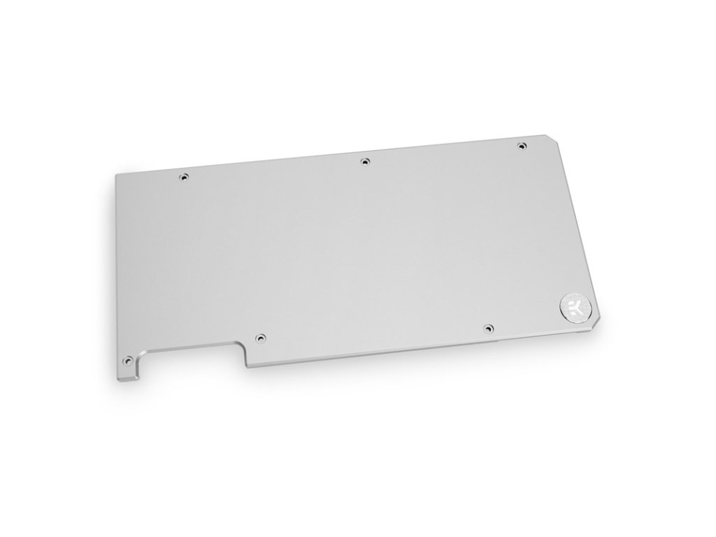 Zadná doska je k dispozícii len v spojení s vhodným chladičom GPU odVodné bloky EK je priskrutkovaný na zadnej strane pixelového akcelerátora a úplne ho zakrýva. Keďže zadná časť grafickej karty je zvyčajne otočená smerom nahor, a preto je v kryte dobre viditeľná, vizuálne vylepšenie je tu oveľa účinnejšie ako na prednej strane grafickej karty.Striebornú poniklovanú hliníkovú dosku zdobí nenápadné a malé logo EK. Okrem toho je povrch hladký. Okrem vizuálneho vylepšenia ponúka zadná doska aj väčšiu stabilitu. Účinne tak zabraňuje tomu, aby sa doska plošných spojov ohýbala v dôsledku jednostranného uťahovania skrutiek pri pripájaní hlavného chladiča a bola tak trvalo vystavená namáhaniu.