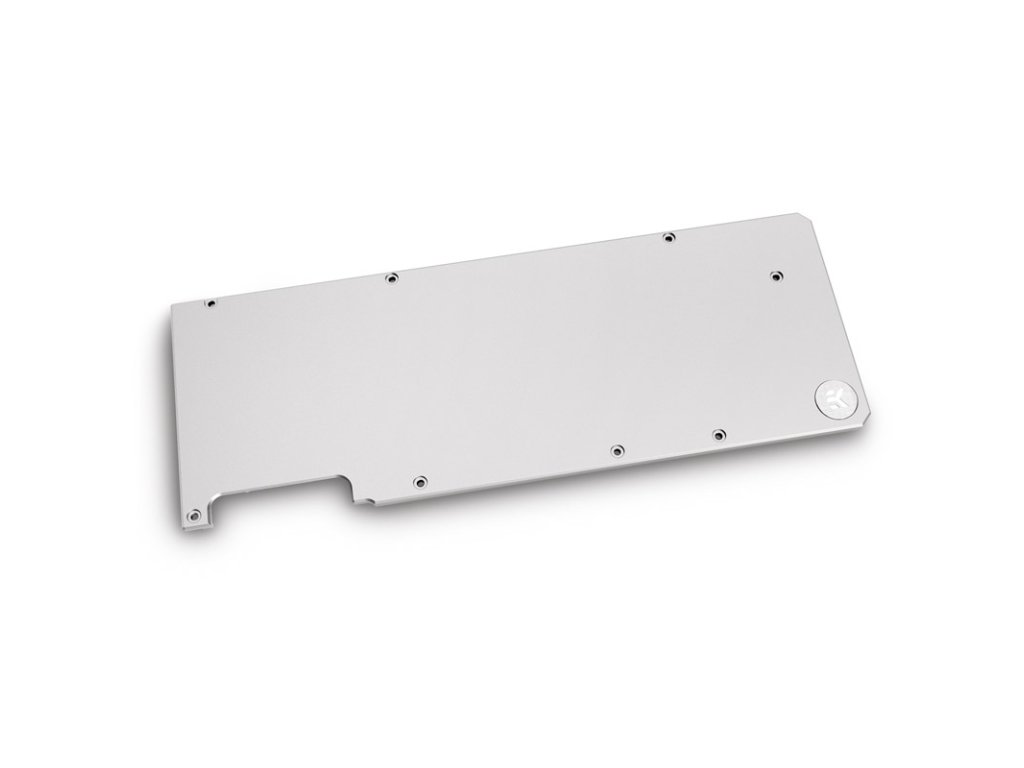 Zadná doska je k dispozícii len v spojení s vhodným chladičom GPU odVodné bloky EK je priskrutkovaný na zadnej strane pixelového akcelerátora a úplne ho zakrýva. Keďže zadná časť grafickej karty je zvyčajne otočená smerom nahor, a preto je v kryte dobre viditeľná, vizuálne vylepšenie je tu oveľa účinnejšie ako na prednej strane grafickej karty.Striebornú poniklovanú hliníkovú dosku zdobí nenápadné a malé logo EK. Okrem toho je povrch hladký. Okrem vizuálneho vylepšenia ponúka zadná doska aj väčšiu stabilitu. Účinne tak zabraňuje tomu, aby sa doska plošných spojov ohýbala v dôsledku jednostranného uťahovania skrutiek pri pripájaní hlavného chladiča a bola tak trvalo vystavená namáhaniu.