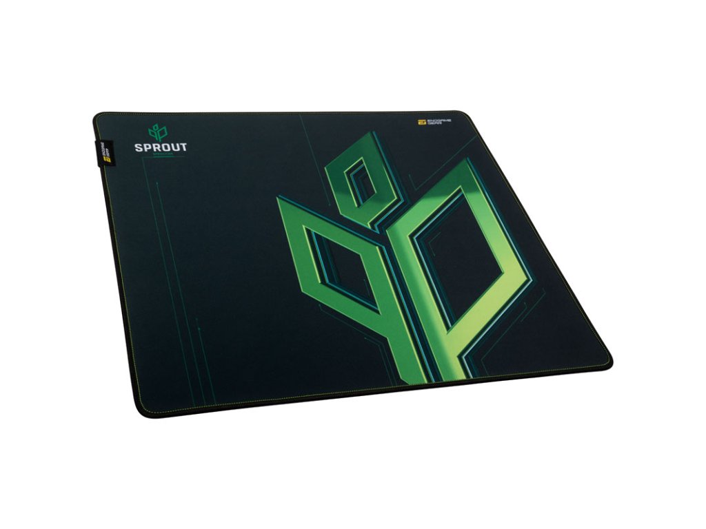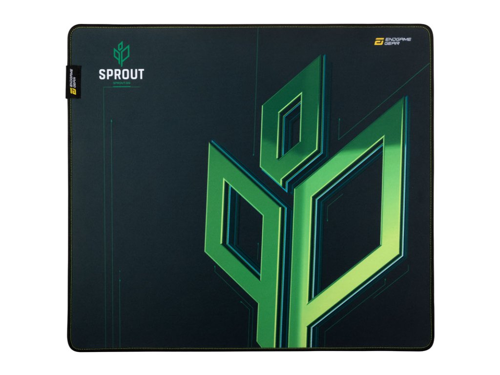 Tmavozelený textilný povrch je zdobenýzelené logo SPROUT v ľavom hornom rohu hernej podložky pod myš je vytlačený nápis V ľavom hornom rohu hernej podložky pod myš je vytlačený slovný a obrazový znak tímu eSports a v pravom hornom rohu sa nachádza logo výrobcu Endgame Gear.