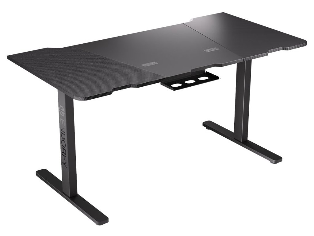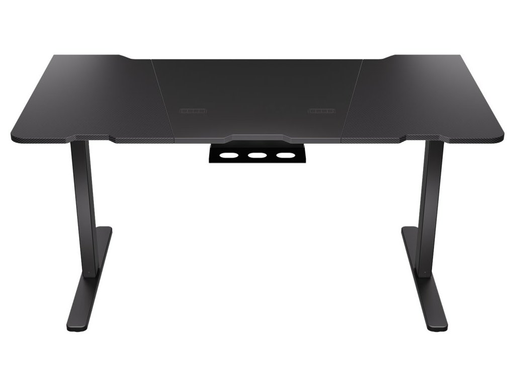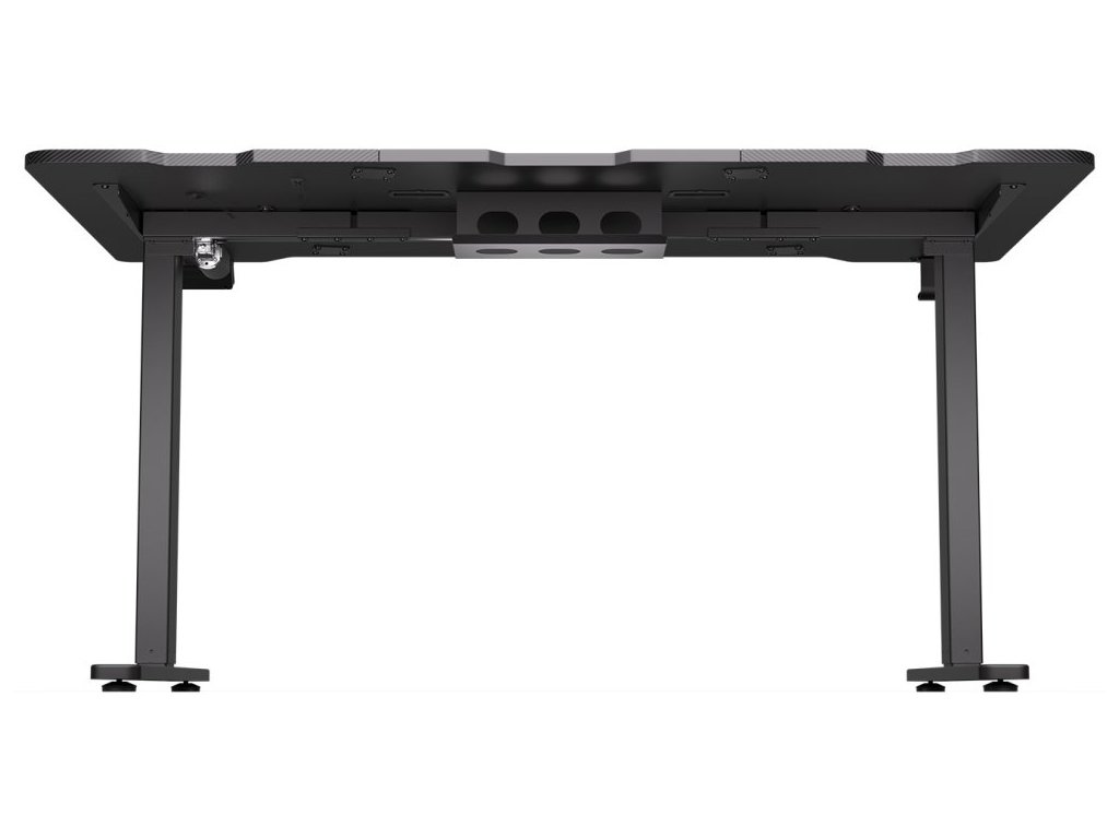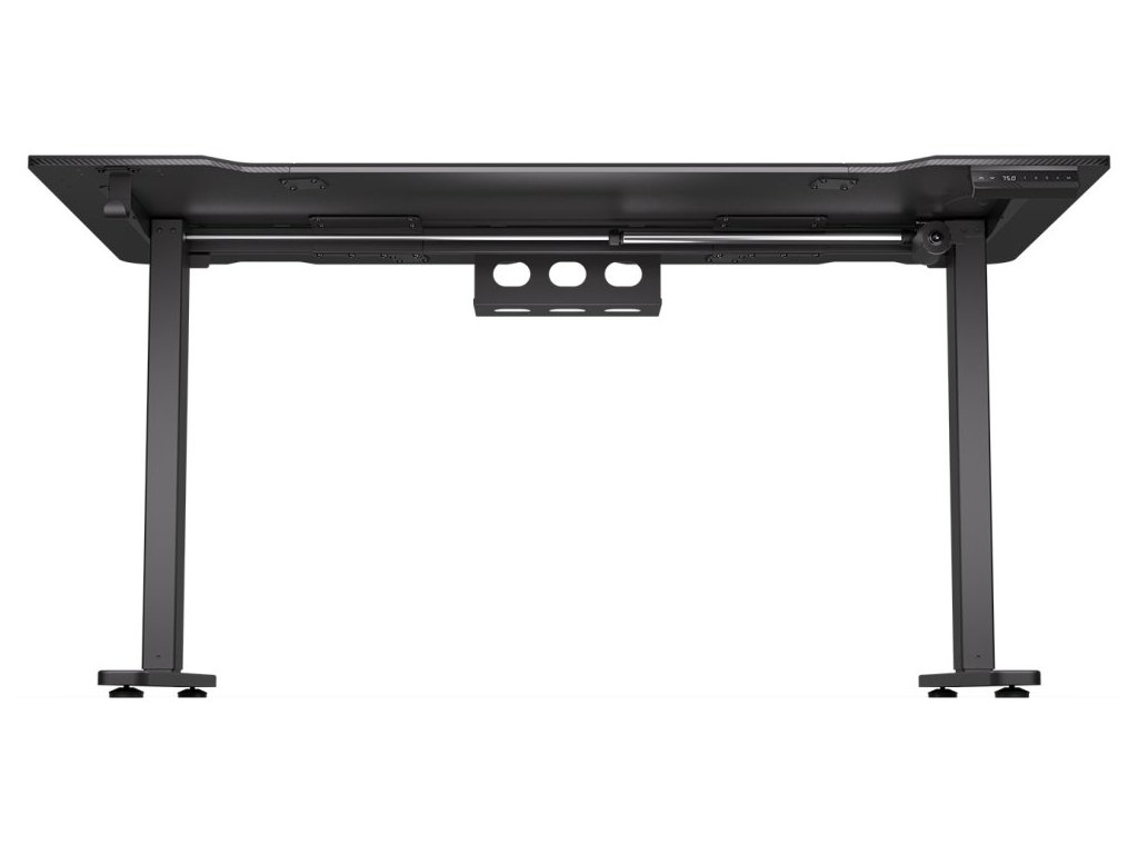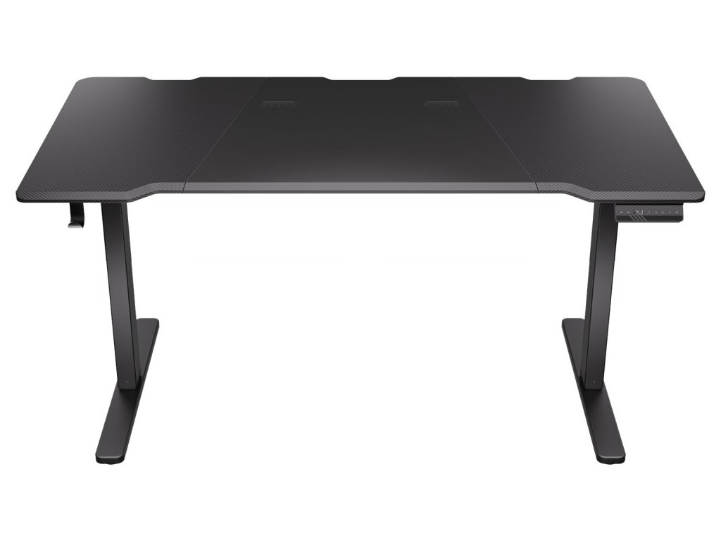 Herní stůl o délce 150 cm a šířce 78 cm nabízí dostatek prostoru pro myš, klávesnici a další příslušenství. Výšku lze plynule nastavit v rozsahu 73 až 120 cm pouhým stisknutím tlačítka na ovládacím panelu, který navíc umožňuje uložit až čtyři nastavení výšky. Na spodní straně desky je umístěn systém pro správu kabelů. Maximální stabilitu zajišťuje robustní ocelová konstrukce s nosností až 80 kg. Povrchová úprava desky stolu ve stylu uhlíkových vláken nejen dobře vypadá, ale je také odolná proti poškrábání. V neposlední řadě zajisté potěší kovová polička pro napájecí lištu na zadní straně a háček pro zavěšení sluchátek.