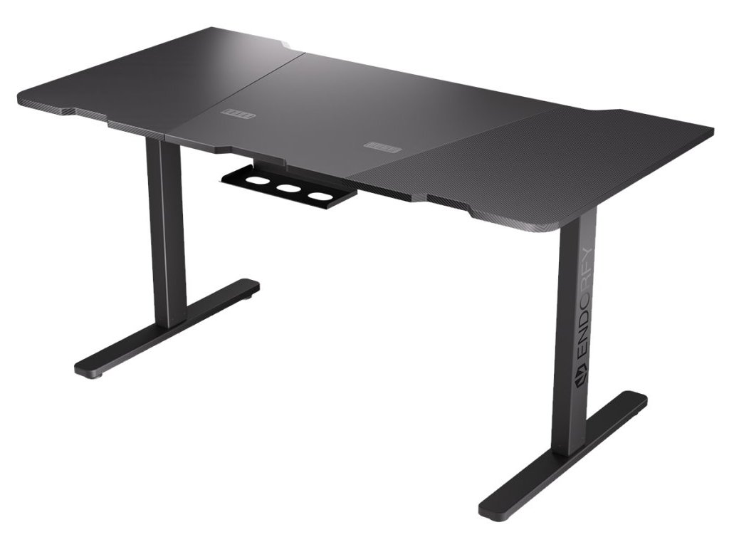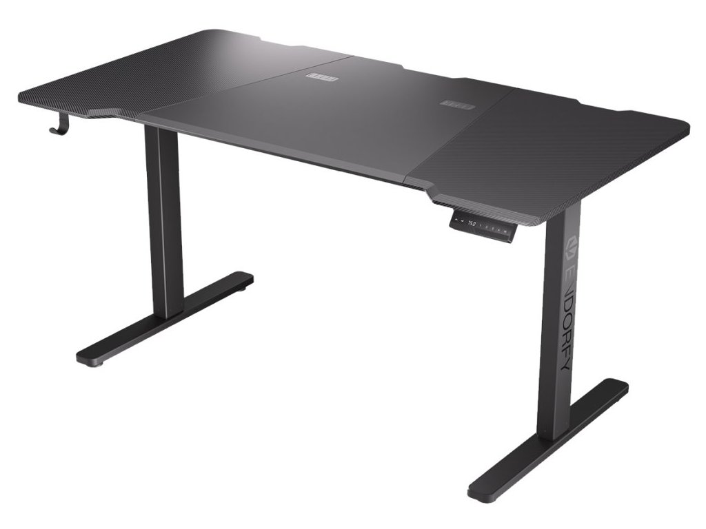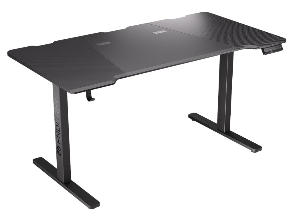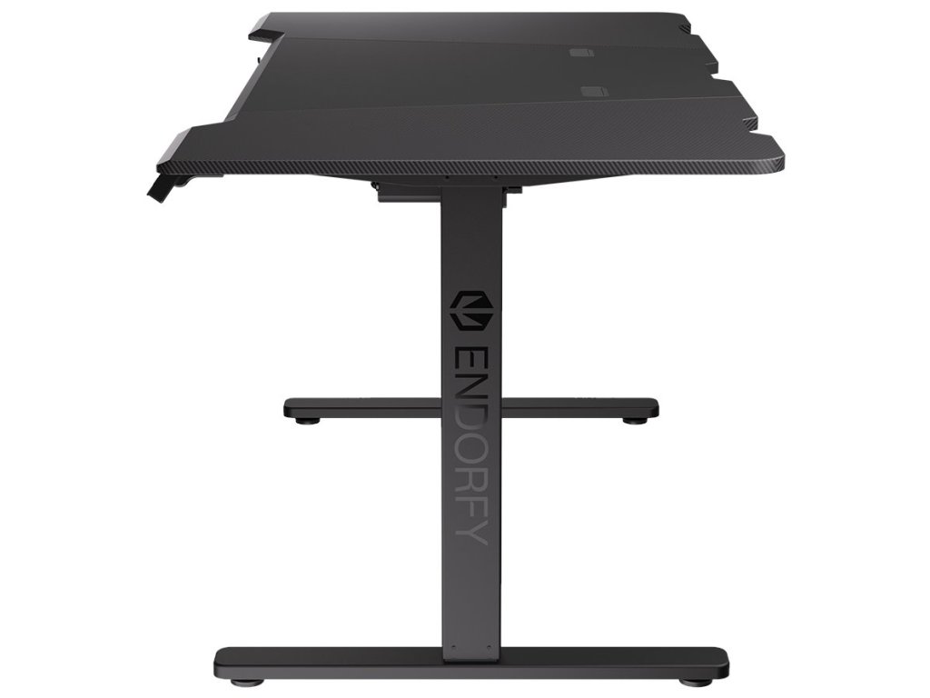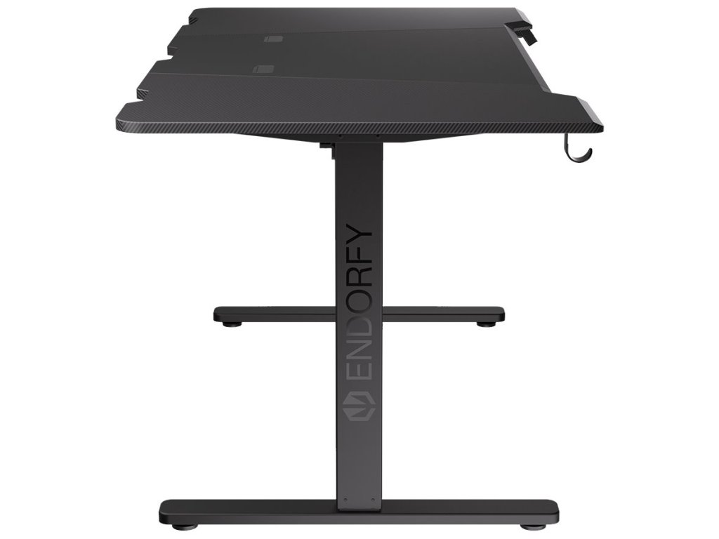 Herní stůl o délce 150 cm a šířce 78 cm nabízí dostatek prostoru pro myš, klávesnici a další příslušenství. Výšku lze plynule nastavit v rozsahu 73 až 120 cm pouhým stisknutím tlačítka na ovládacím panelu, který navíc umožňuje uložit až čtyři nastavení výšky. Na spodní straně desky je umístěn systém pro správu kabelů. Maximální stabilitu zajišťuje robustní ocelová konstrukce s nosností až 80 kg. Povrchová úprava desky stolu ve stylu uhlíkových vláken nejen dobře vypadá, ale je také odolná proti poškrábání. V neposlední řadě zajisté potěší kovová polička pro napájecí lištu na zadní straně a háček pro zavěšení sluchátek.