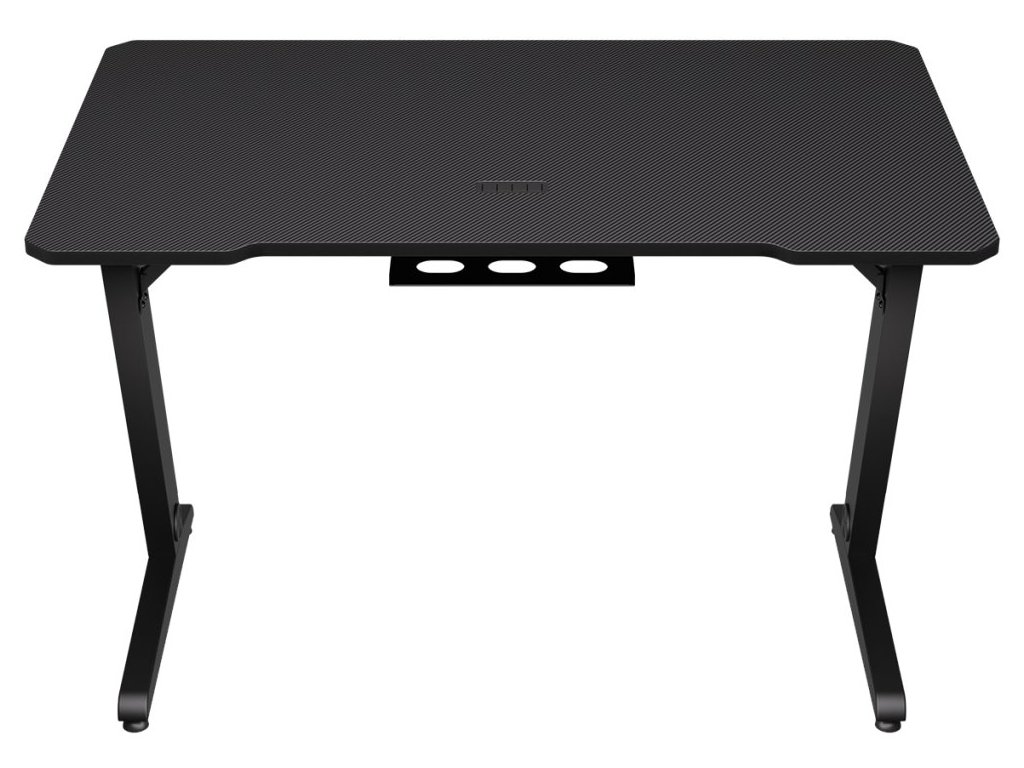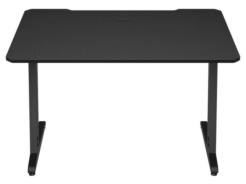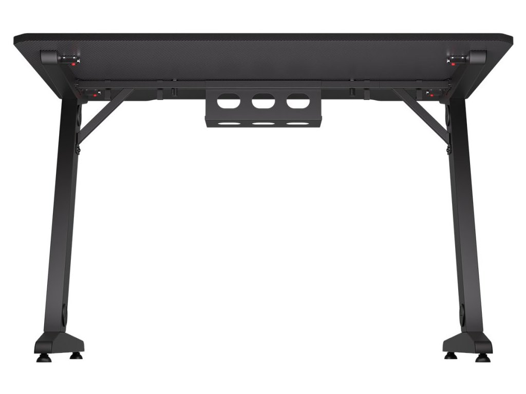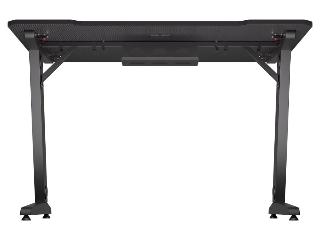 Herní stůl o délce 114 cm a šířce 74 cm nabízí dostatek prostoru pro myš, klávesnici a další příslušenství. Na spodní straně desky je umístěn systém pro správu kabelů, které lze následně vést průchodkami v nohách stolu. Maximální stabilitu zajišťuje robustní ocelová konstrukce s nosností až 80 kg. Povrchová úprava desky stolu ve stylu uhlíkových vláken nejen dobře vypadá, ale je také odolná proti poškrábání. V neposlední řadě zajisté potěší kovová polička pro napájecí lištu umístěná na zadní straně.