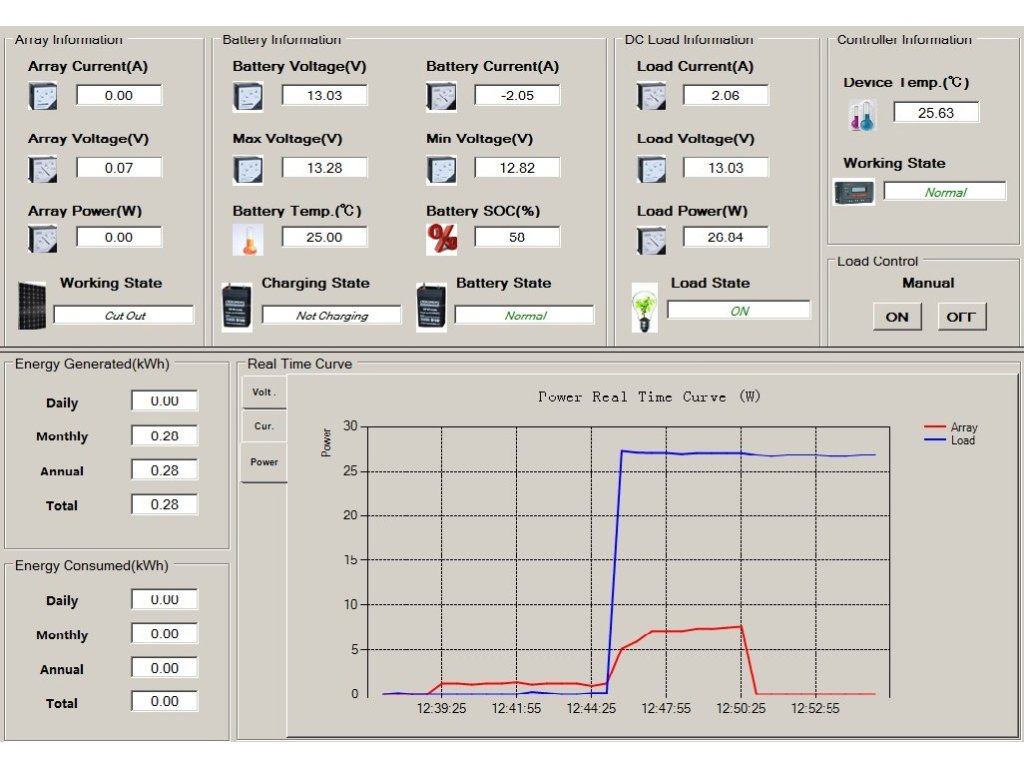 Díky tomuto převodníku je možné kontrolovat tok energie ze solárního panelu přímo na obrazovce monitoru. Dále je možné zobrazovat napětí baterie, solárního panelu nebo teplotu. Výhoda tohoto řešení spočívá mimo jiné v možnosti veškeré tyto informace ukládat do souboru s možností dalšího zpracování (tvorba grafů apod.).