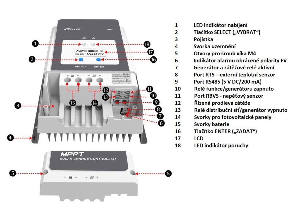 Přímo v MPPT regulátoru je integrován multifunkční displej pro snadný monitoring systému a případné nastavení provozních parametrů vč. kontrolních LED diod. Regulátor z řady Tracer AN je založený na technologii vícefázového synchronního usměrnění (MSRT) a pokročilém řídicím algoritmu MPPT, s architekturou dvoujádrového procesoru a společným mínus pólem. MSRT může zaručit velmi vysokou účinnost přeměny v jakémkoli nabíjecím výkonu, což zřetelně zlepšuje energetickou účinnost solárního systému.