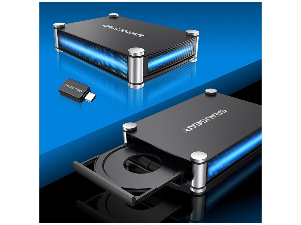 GRAUGEAR G-5251 otvára možnosť podpory 5,25" mechaník Blu-Ray/DVD/CD. Tento externý kryt premení internú 5,25" jednotku SATA na externe použiteľného "partnera" pre notebooky, počítače a iné zariadenia, ktoré už nemajú interné optické jednotky. Robustný hliníkový kryt má štýlový dizajn s modrými LED diódami na troch stranách.