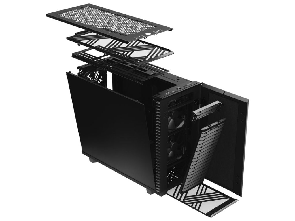 Prepohodlná inštalácia všetkých komponentov kryt krytu je možné úplne odstrániť. Ak sa odstránia aj bočné panely, midi veža je voľne prístupná z troch strán. To výrazne zjednodušuje inštaláciu komponentov aj vedenie káblov. Bočné panely a horný panel sú tiež vybavenébeznástrojový mechanizmus push-to-lock vybavené.Pogumované káblové vedenia a celých 30 milimetrov priestoru za priehradkou na základnú dosku uľahčuje správu káblov. NovýViacnásobné konzoly zDefinovať 7 umožňujú premeniť ľubovoľný voľný slot ventilátora na držiak pevného disku, SSD, čerpadla alebo expanznej nádoby a možno ich umiestniť na rôzne miesta v skrini.