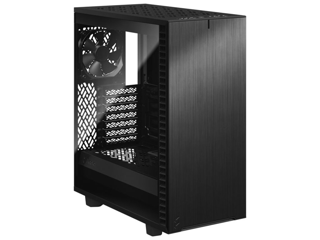 Po zatvorení saDefinovať 7 Kompaktný dojem, že bol odliaty z jednej formy: dizajn jerovné línie, hladké vonkajšie povrchy a obdĺžnikové tvary charakterizované. Je to spôsobené aj elegantnýmPredná časť s povrchovou úpravou z brúseného hliníka je.StránkaFractal Design Define 7 Compact je k dispozícii v rôznych verziách a farbách. Uzavreté vonkajšie panely sú vždy vybavenéIzolácia proti hluku z bitúmenu čo účinne znižuje hladinu hluku. Súčasťou krytu je druhý horný kryt s vetracími otvormi.Bočné panely s tvrdeným sklom nie sú zvukovo izolované. Táto verziaDefinovať 7 Kompaktný je zvnútra aj zvonku vyhotovený v čiernej farbe. Ľavý bočný panel je vybavený čírym tvrdeným sklom a pravý bočný panel je vyrobený z oceľového plechu so zvukovou izoláciou.
