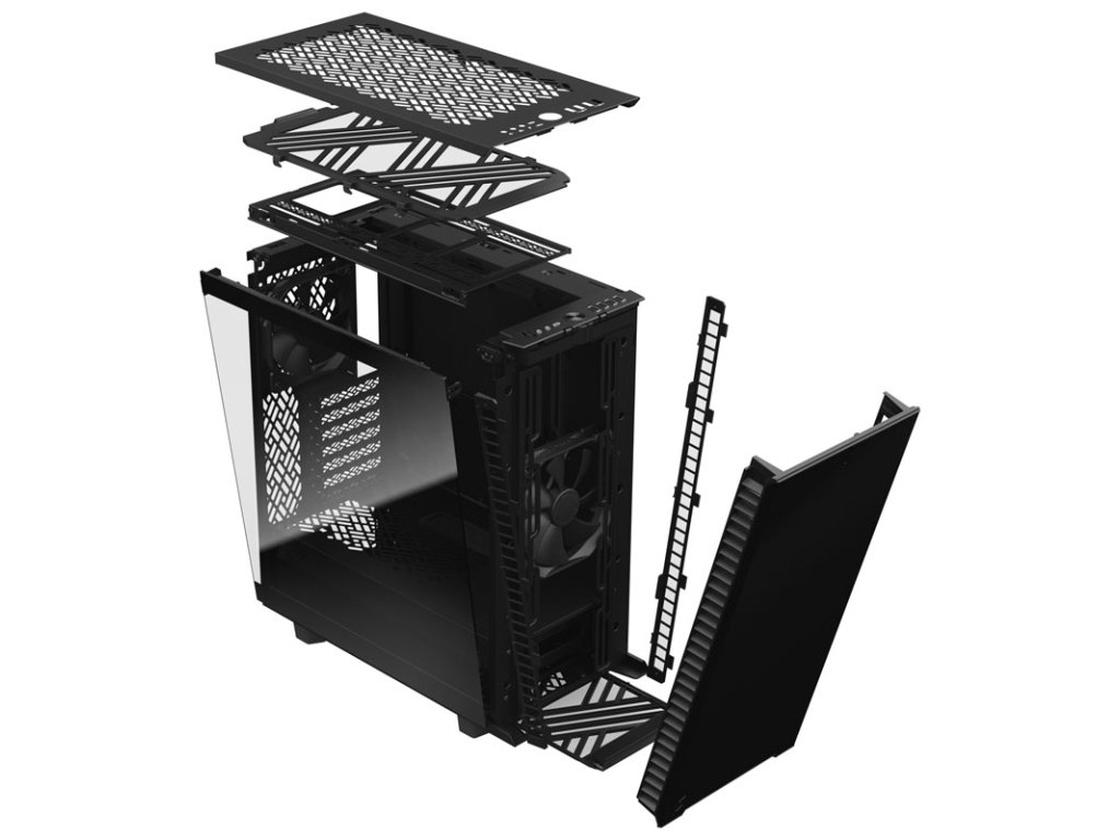 Prepohodlná inštalácia všetkých komponentov kryt krytu je možné úplne odstrániť. Ak sa odstránia aj bočné panely, midi veža je voľne prístupná z troch strán. To výrazne zjednodušuje inštaláciu komponentov aj vedenie káblov. Bočné panely a horný panel sú tiež vybavenébeznástrojový mechanizmus push-to-lock vybavené.Pogumované káblové vedeniasprávu káblov uľahčujú suché zipsy a celých 28 milimetrov priestoru za priehradkou na základnú dosku. Voliteľne dostupnýViacnásobné konzoly preDefinícia radu 7 umožňujú premeniť ľubovoľný voľný slot ventilátora na držiak pevného disku, SSD, čerpadla alebo expanznej nádoby a možno ich umiestniť na rôzne miesta v skrini.