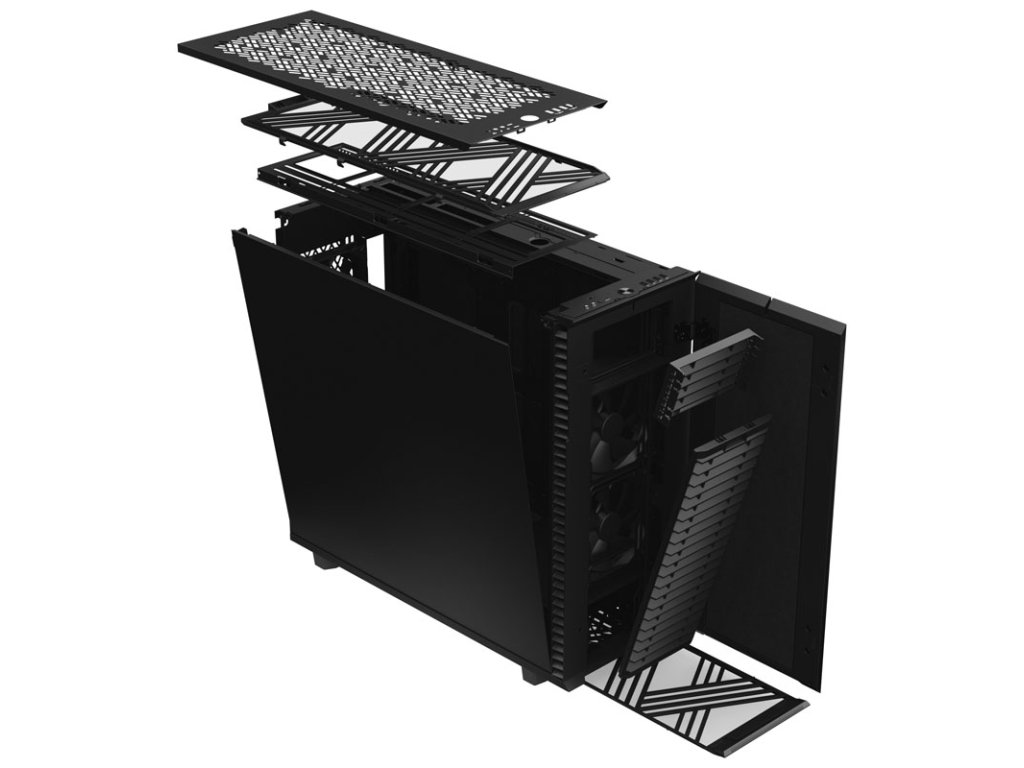Prepohodlná inštalácia všetkých komponentov kryt krytu je možné úplne odstrániť. Ak sa odstránia aj bočné panely, veža Big Tower je voľne prístupná z troch strán. To výrazne uľahčuje inštaláciu komponentov aj kladenie káblov. Bočné panely a horný panel sú tiež vybavenébeznástrojový mechanizmus push-to-lock vybavené.Pogumované káblové vedenia a celých 30 milimetrov priestoru za priehradkou na základnú dosku uľahčuje správu káblov. NovýViacnásobné konzoly zDefinovať 7 XL umožňujú premeniť ľubovoľný voľný slot ventilátora na držiak pevného disku, SSD, čerpadla alebo expanznej nádoby a možno ich umiestniť na rôzne miesta v skrini.