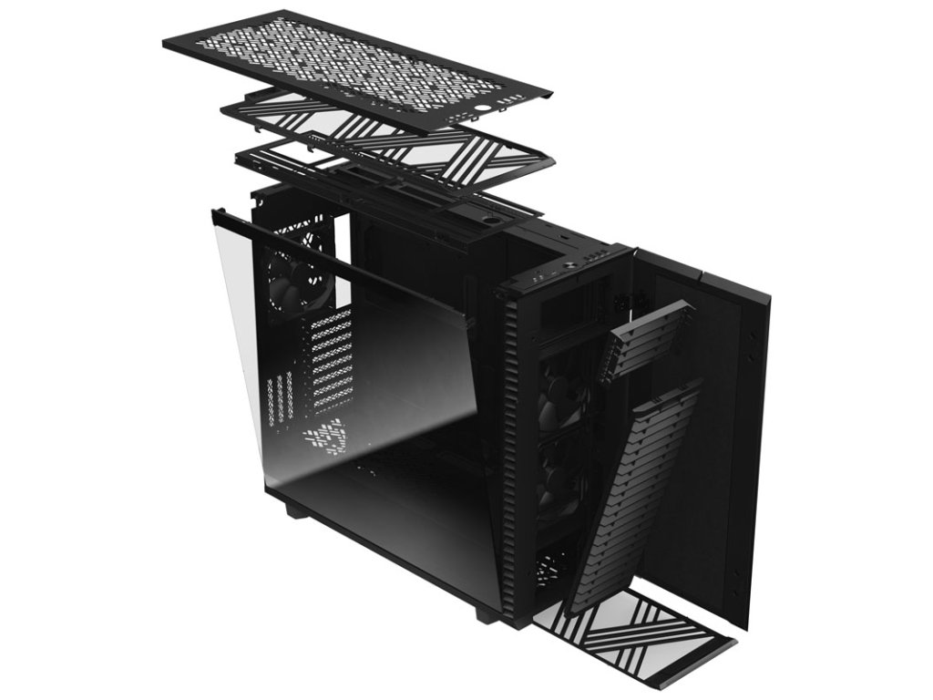 Prepohodlná inštalácia všetkých komponentov kryt krytu je možné úplne odstrániť. Ak sa odstránia aj bočné panely, veža Big Tower je voľne prístupná z troch strán. To výrazne uľahčuje inštaláciu komponentov aj kladenie káblov. Bočné panely a horný panel sú tiež vybavenébeznástrojový mechanizmus push-to-lock vybavené.Pogumované káblové vedenia a celých 30 milimetrov priestoru za priehradkou na základnú dosku uľahčuje správu káblov. NovýViacnásobné konzoly zDefinovať 7 XL umožňujú premeniť ľubovoľný voľný slot ventilátora na držiak pevného disku, SSD, čerpadla alebo expanznej nádoby a možno ich umiestniť na rôzne miesta v skrini.