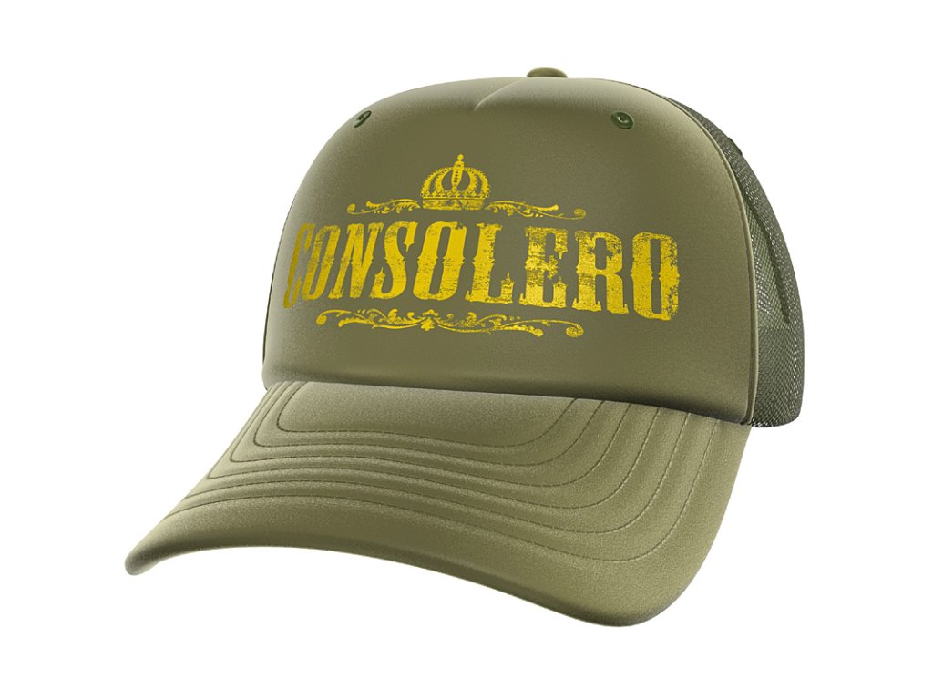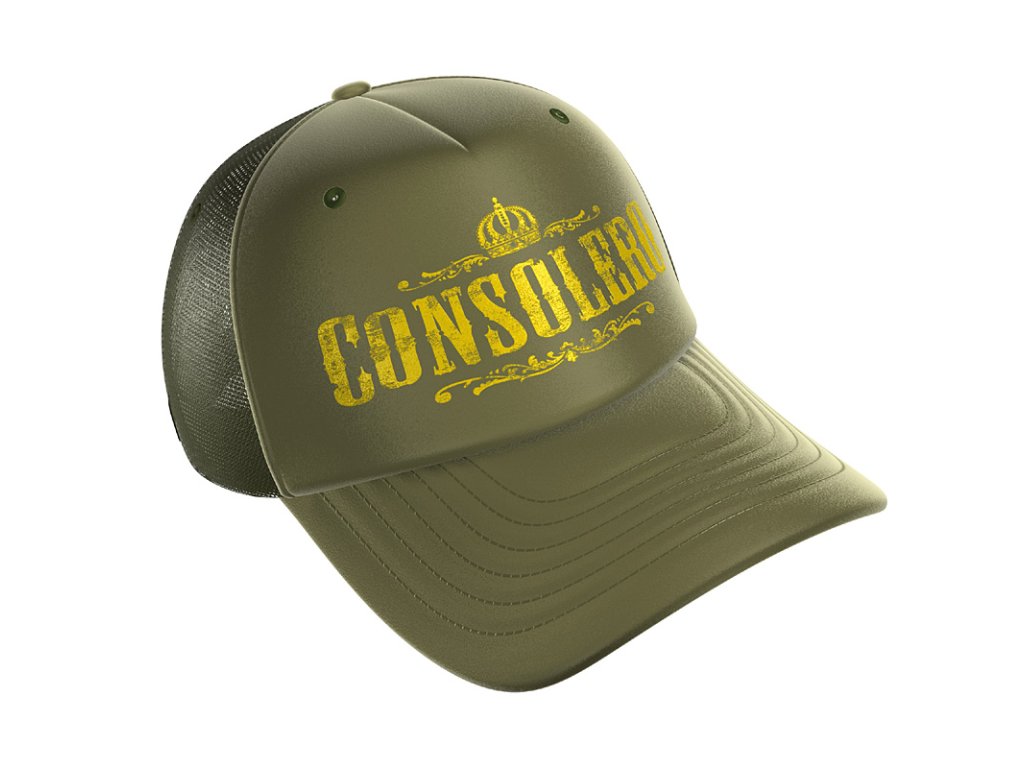 Kšiltovka trucker olivovej farby so žltou potlačou Consolero na prednej strane, tkaným štítkom GamersWear na boku a nastaviteľným zapínaním vzadu.100% bavlna