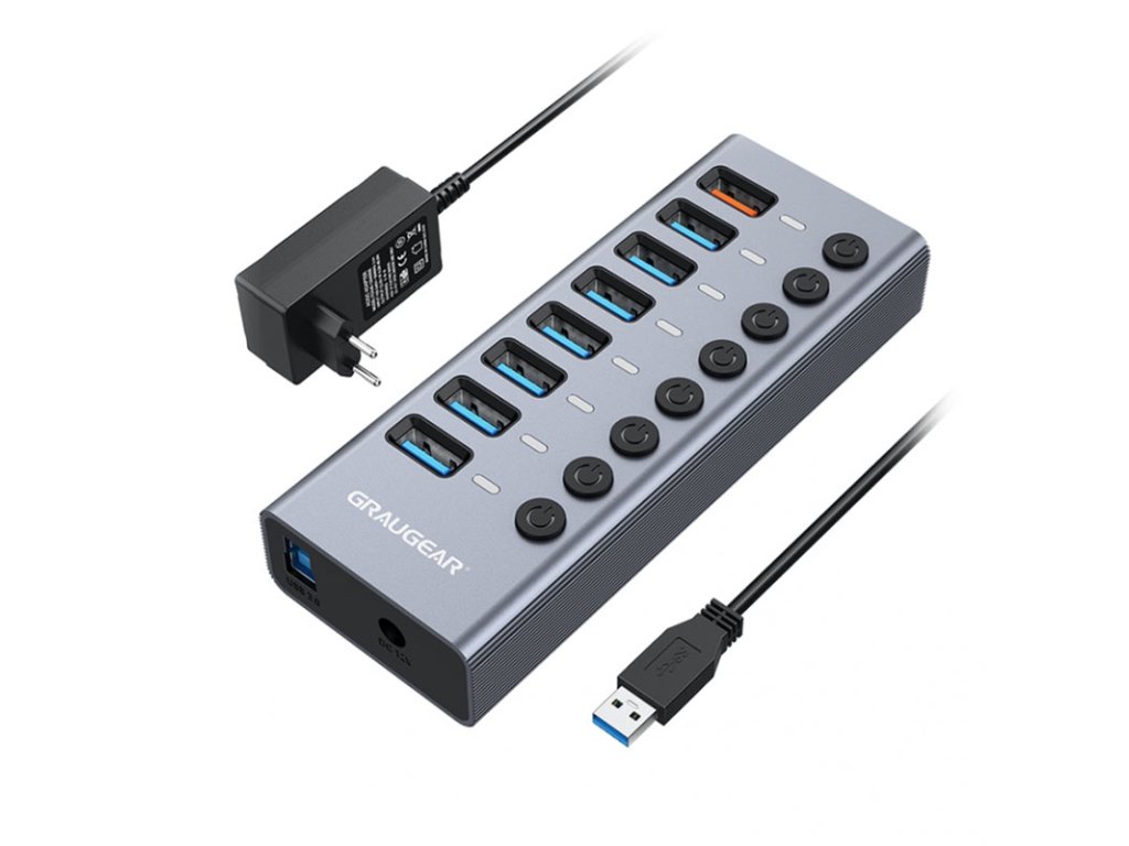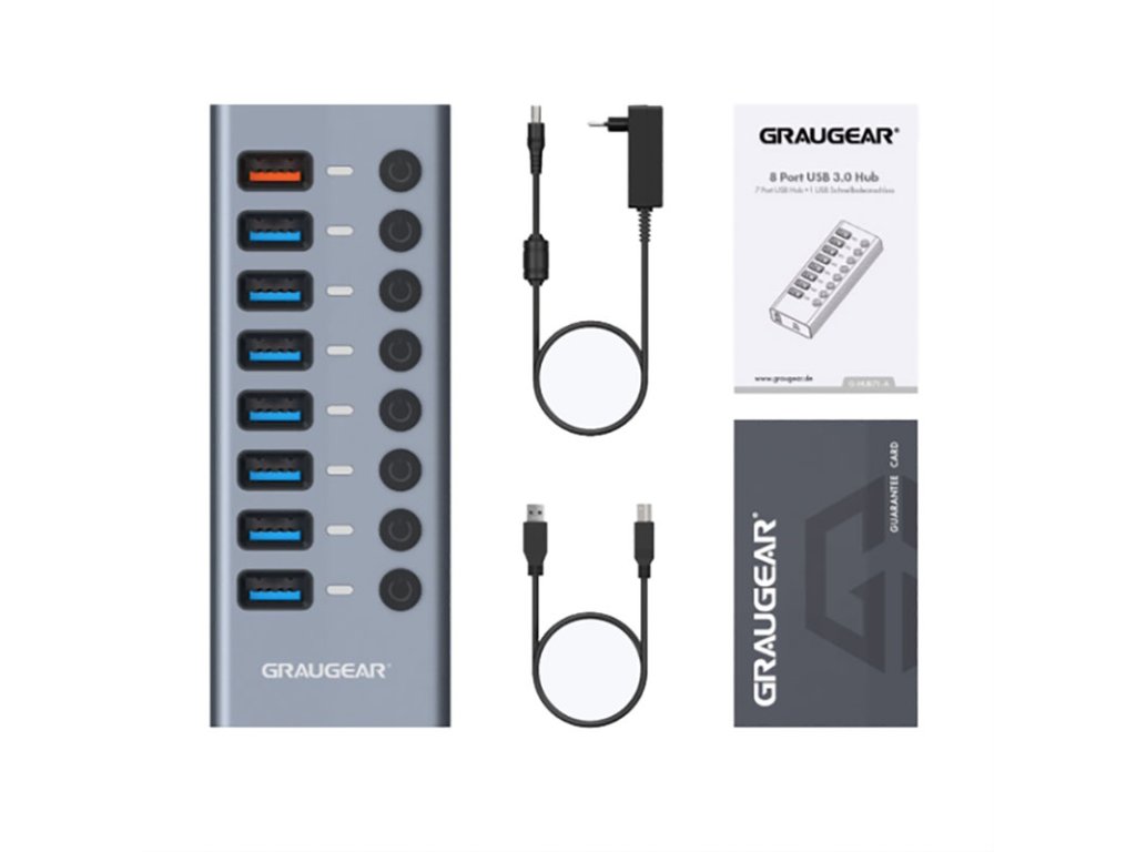 S dodanou 48-wattovou napájacou jednotkouG-HUB71-A k aktívnej nabíjačke. Ôsmy port USB je k dispozícii ako port pre rýchle nabíjanie. Pripojenie je zabezpečené prostredníctvom konektora USB 3.0 B na rozbočovači a konektora USB typu A na koncovom zariadení.