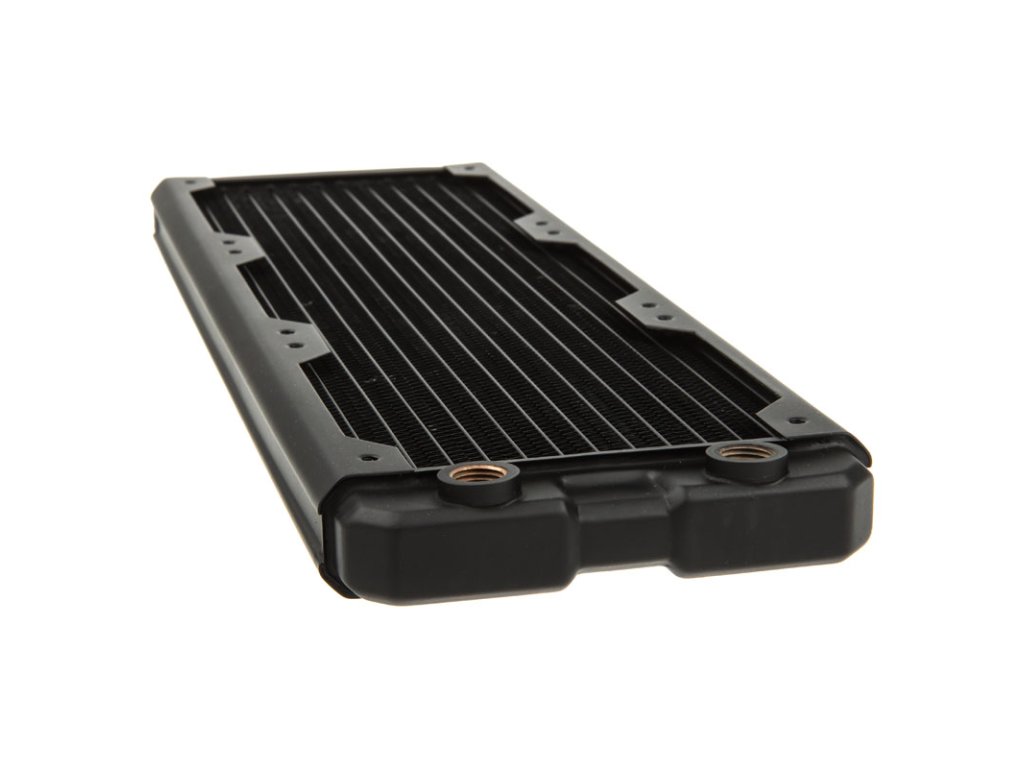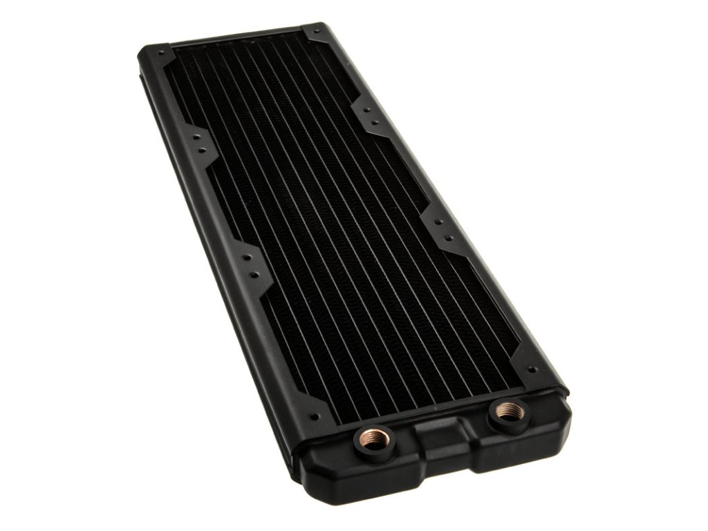 To znamená, že trojitý chladič Black Ice Nemesis GTS 360, ktorý je tu v ponuke, môže niesť tri 120 mm ventilátory a na montáž sú našťastie k dispozícii vysoko kompatibilné závity M4. Súčasťou štandardnej výbavy sú aj celkom dve G1/4-palcové vstupné a výstupné armatúry. Nízkoprofilový chladič má medené jadro a mosadzné predkomory.