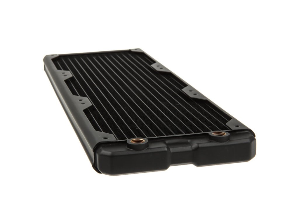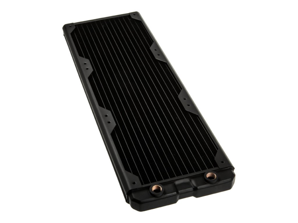 To znamená, že trojitý chladič Black Ice Nemesis GTS 420, ktorý je tu v ponuke, môže niesť tri 140 mm ventilátory a na montáž sú našťastie k dispozícii vysoko kompatibilné závity M4. Súčasťou štandardnej výbavy sú aj celkom dve G1/4-palcové vstupné a výstupné armatúry. Nízkoprofilový chladič má medené jadro a mosadzné predkomory.