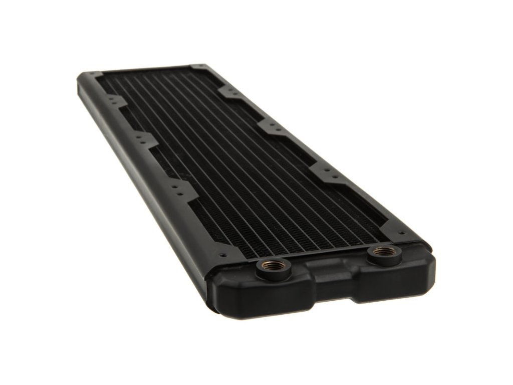 To znamená, že tu ponúkaný štvorica chladičov Black Ice Nemesis GTS 480 môže niesť štyri 120 mm ventilátory a na montáž sú našťastie k dispozícii vysoko kompatibilné závity M4. Súčasťou štandardnej výbavy sú aj celkom dve vstupné a výstupné koncovky G1/4 palca. Nízkoprofilový radiátor má medené jadro a mosadzné predkomory.