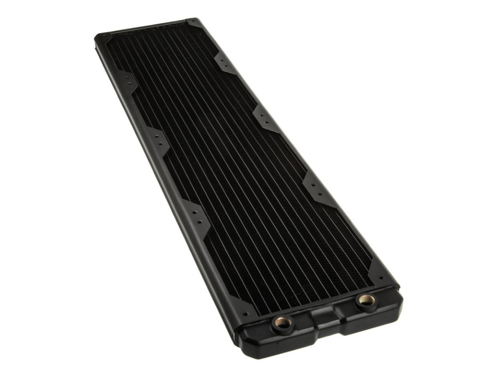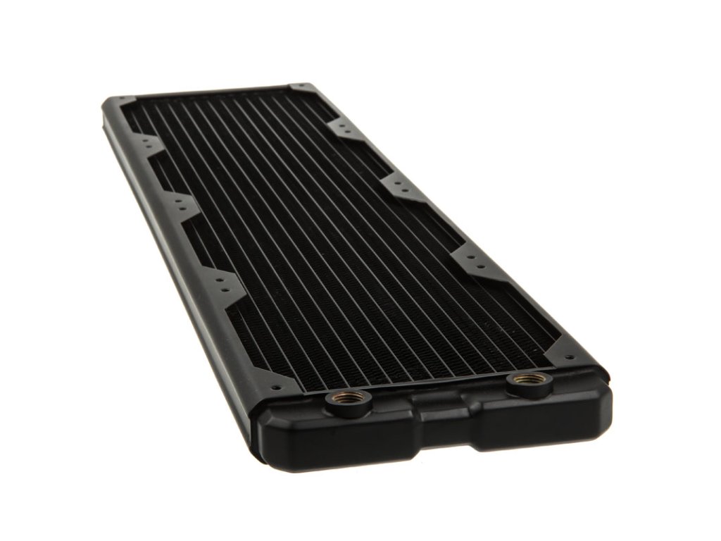 To znamená, že tu ponúkaný štvorica chladičov Black Ice Nemesis GTS 560 môže niesť štyri 140 mm ventilátory a na montáž sú našťastie k dispozícii vysoko kompatibilné závity M4. Súčasťou štandardnej výbavy sú aj celkom dve vstupné a výstupné koncovky G1/4 palca. Nízkoprofilový chladič má medené jadro a mosadzné predkomory.