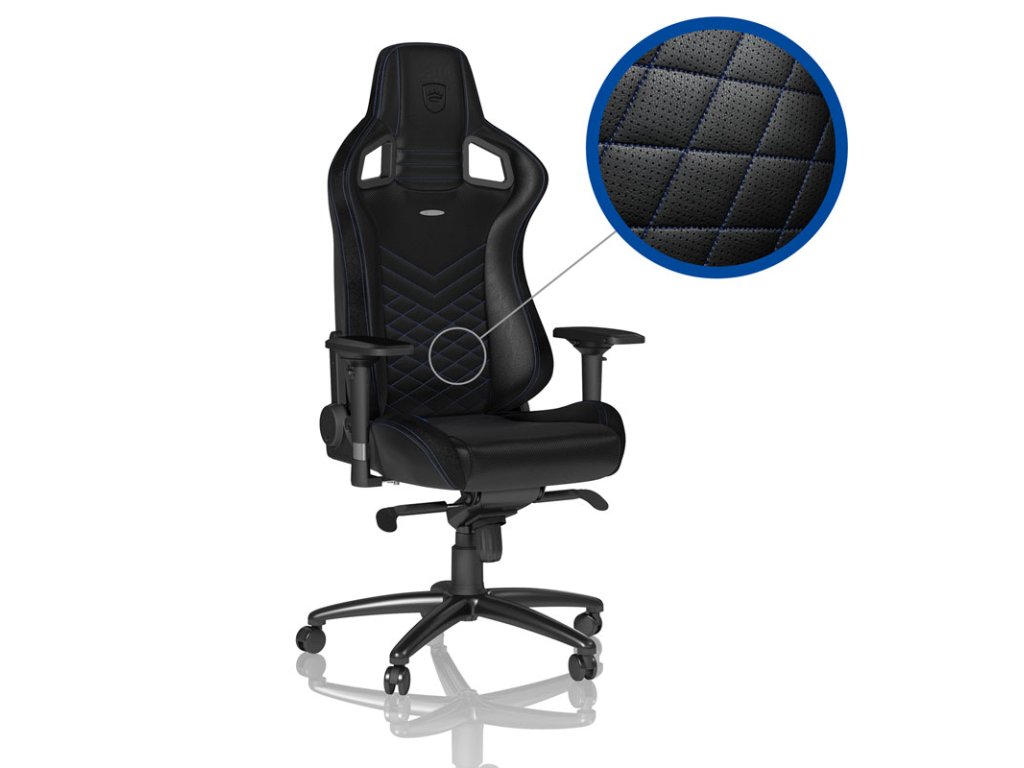 Herná stolička noblechairs EPIC, ktorá sa tu ponúka v čiernej verzii s modrým prešívaním, je potiahnutá poťahom zo syntetickej kože PU s pomerne vysokou hrúbkou materiálu. Kombinácia studenej peny s otvorenými bunkami a perforovaného poťahu s diamantovým vzorom v bedrovej oblasti a na sedadle zabraňuje poteniu bez ohľadu na to, aké horúce sú bitky. Modré šitie na švoch a operadle bolo vytkávané s mimoriadnou presnosťou pomocou priemyselných vyšívacích strojov a poskytuje elegantný kontrast k čiernej imitácii PU kože.