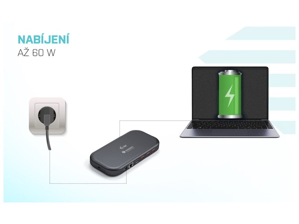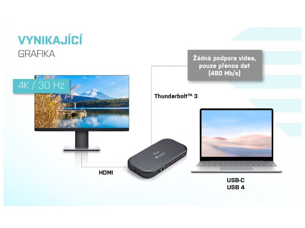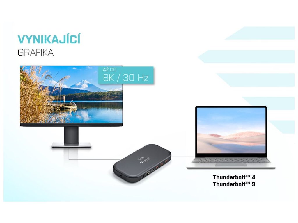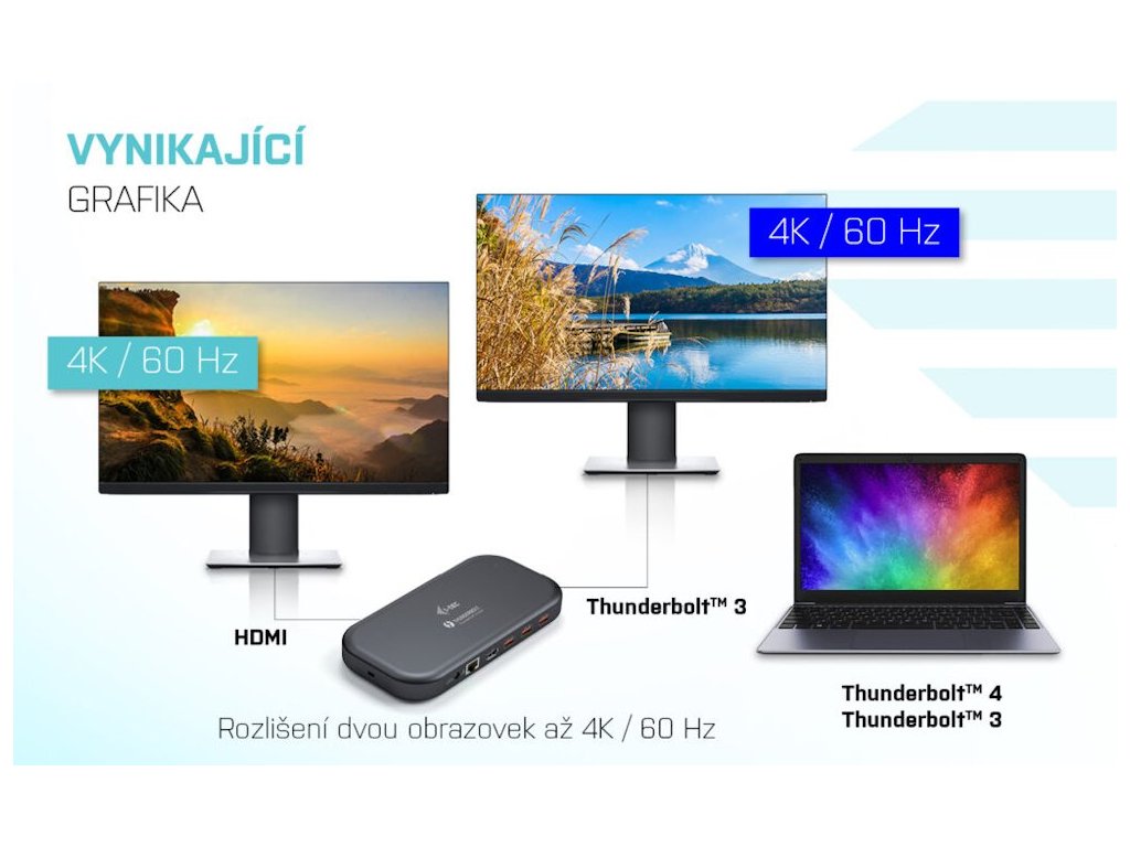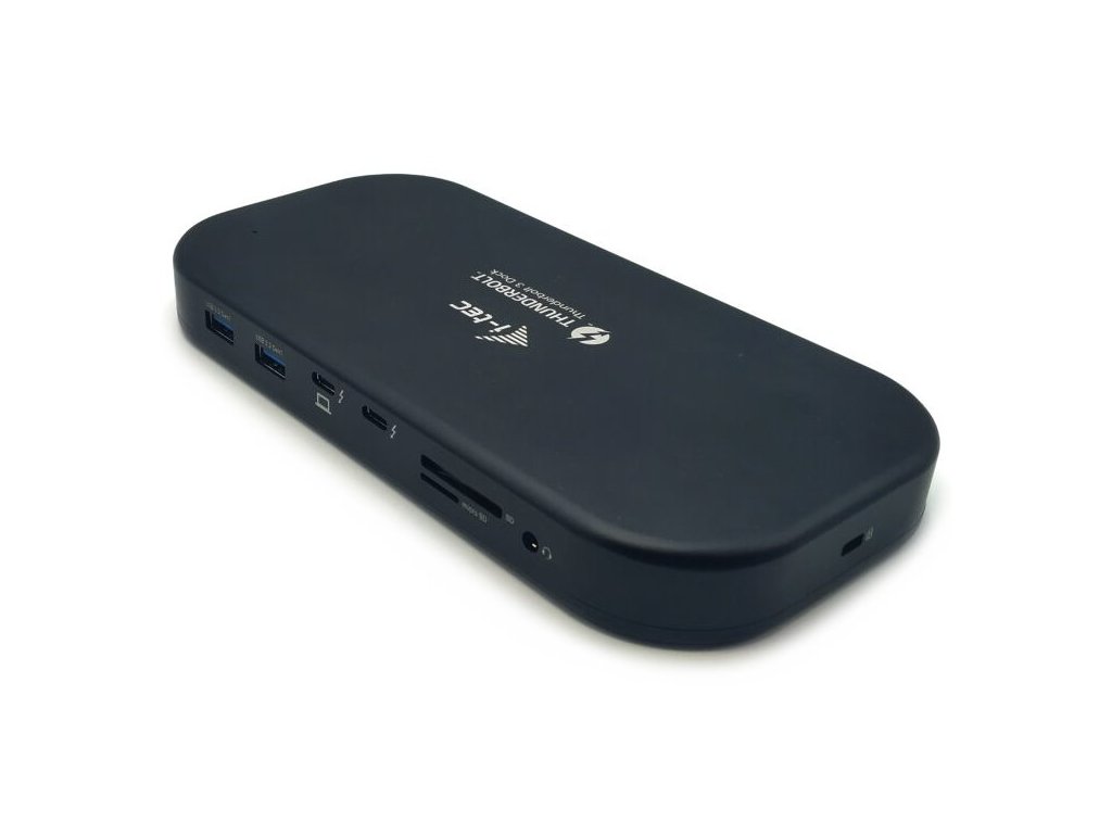 I-TEC Thunderbolt 3 Dual 4K Dock 60 WDokovací stanice nabízející hned několik praktických portů. K počítači či notebooku se připojuje pomocí konektoru Thunderbolt 3 a je tak schopná na podporovaných zařízeních přenášet i napájení až 60 W. K dokovací stanici lze připojit až dva 4K monitory skrze porty HDMI a Thunderbolt 3. V případě jednoho monitoru připojeného skrze rozhraní Thunderbolt 3 je podporováno rozlišení až 8K i technologie HDR, AMD FreeSync a NVIDIA G-Sync. Vysokorychlostní přístup k internetu lze realizovat skrze přítomný RJ-45 port. Tři USB 3.1 a dva USB 3.0 konektory, všechny s podporou rychlého nabíjení BC 1.2, poslouží pro připojení vašich periferií. Čtečka SD a microSD karet pomůže s přenosem dat. Pro připojení sluchátek či mikrofonu pak slouží kombinovaný 3,5 mm konektor. Zajisté potěší také slot pro bezpečnostní zámek.