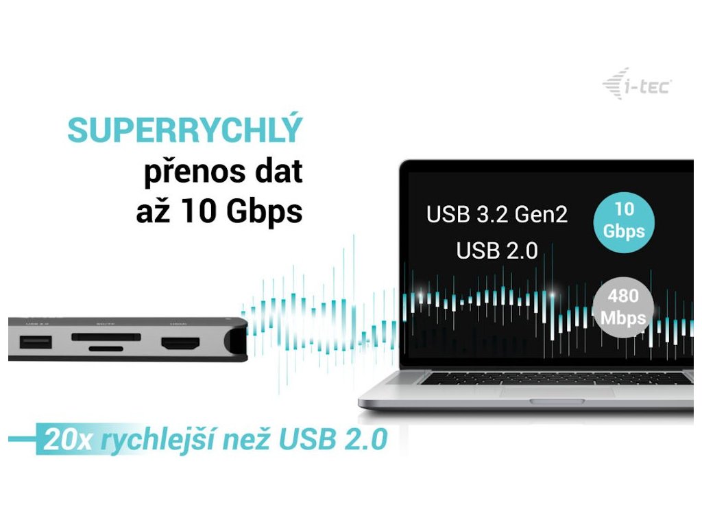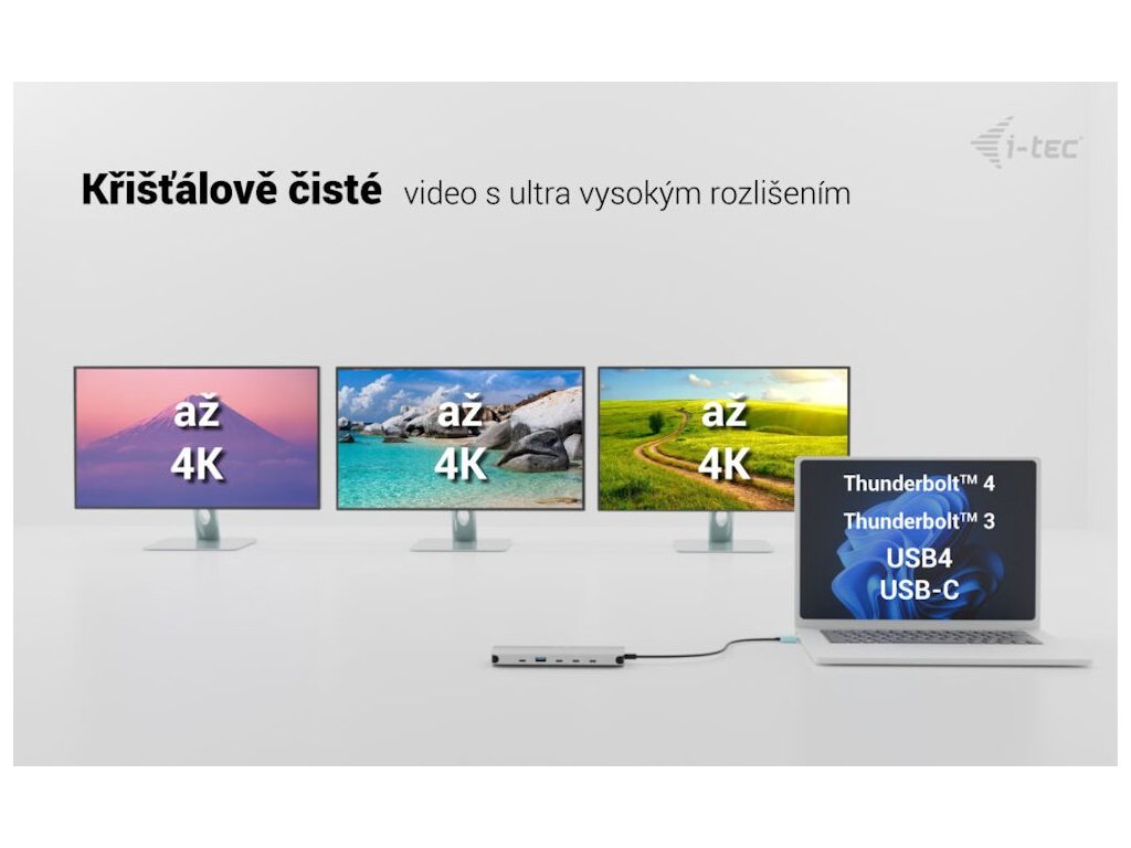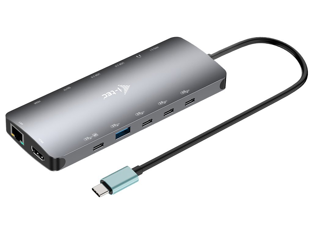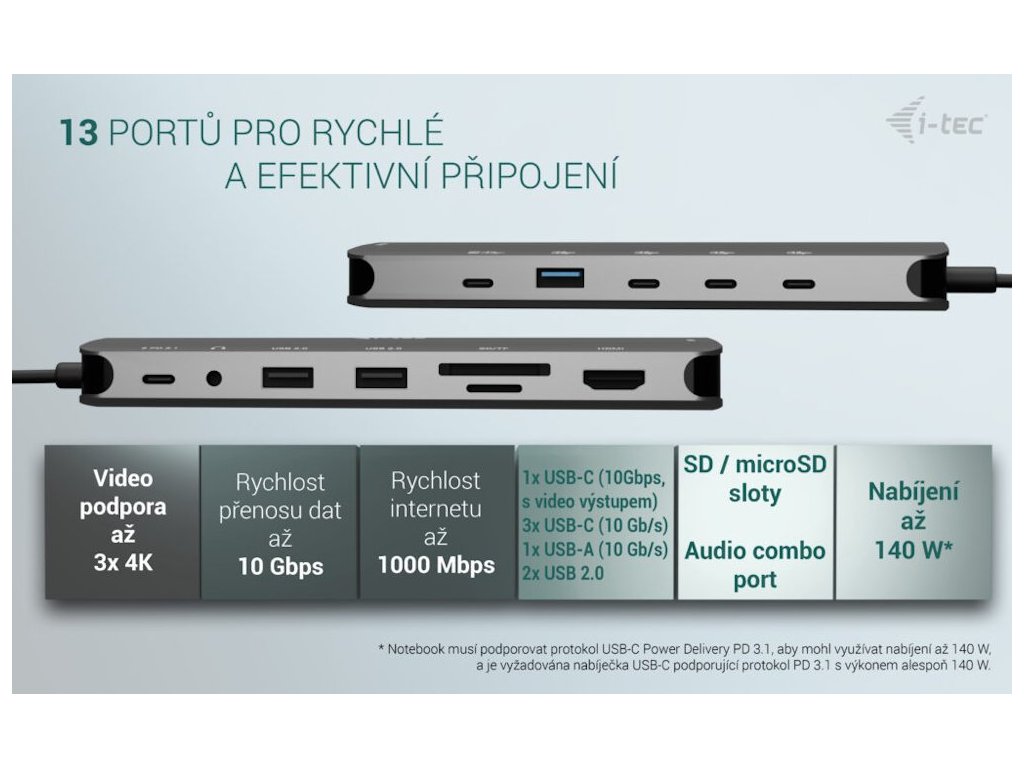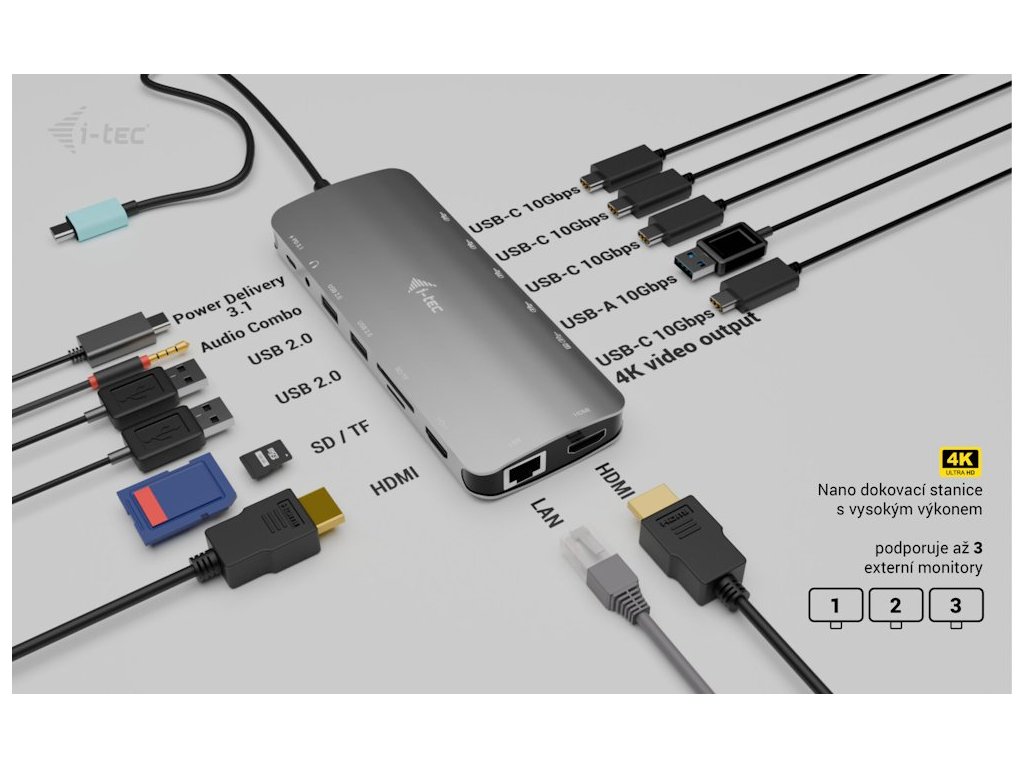 I-TEC USB-C Metal Nano 3× Display Dock 140 WKompaktní kovová dokovací stanice vhodná pro uživatele pracující s 4K rozlišením. K počítači či notebooku se připojuje pomocí USB-C portu s podporou Thunderbolt 3/4 a je tak schopná na podporovaných zařízeních přenášet i napájení až 140 W. Nabízí připojení až tří 4K monitorů. Vysokorychlostní přístup k internetu lze realizovat skrze přítomný RJ-45 port. Pro připojení periférií jsou přítomny dva USB 2.0 porty, jeden port USB 3.1 a pět USB-C portů, tři pro data, jeden s funkcí power delivery a jeden pro video. Mimo to je k dispozici i čtečka microSD a SD karet. Pro připojení sluchátek či mikrofonu pak slouží kombinovaný 3,5 mm konektor.