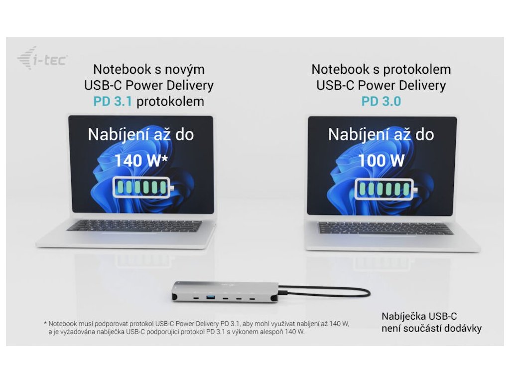 Pokud váš notebook nebo tablet podporuje nový a moderní nabíjecí protokol USB-C Power Delivery PD 3.1, dokovací stanice nabídne nabíjecí výkon až 140 W (pokud máte protokol PD 3.0, nabíjecí výkon bude až 100 W).