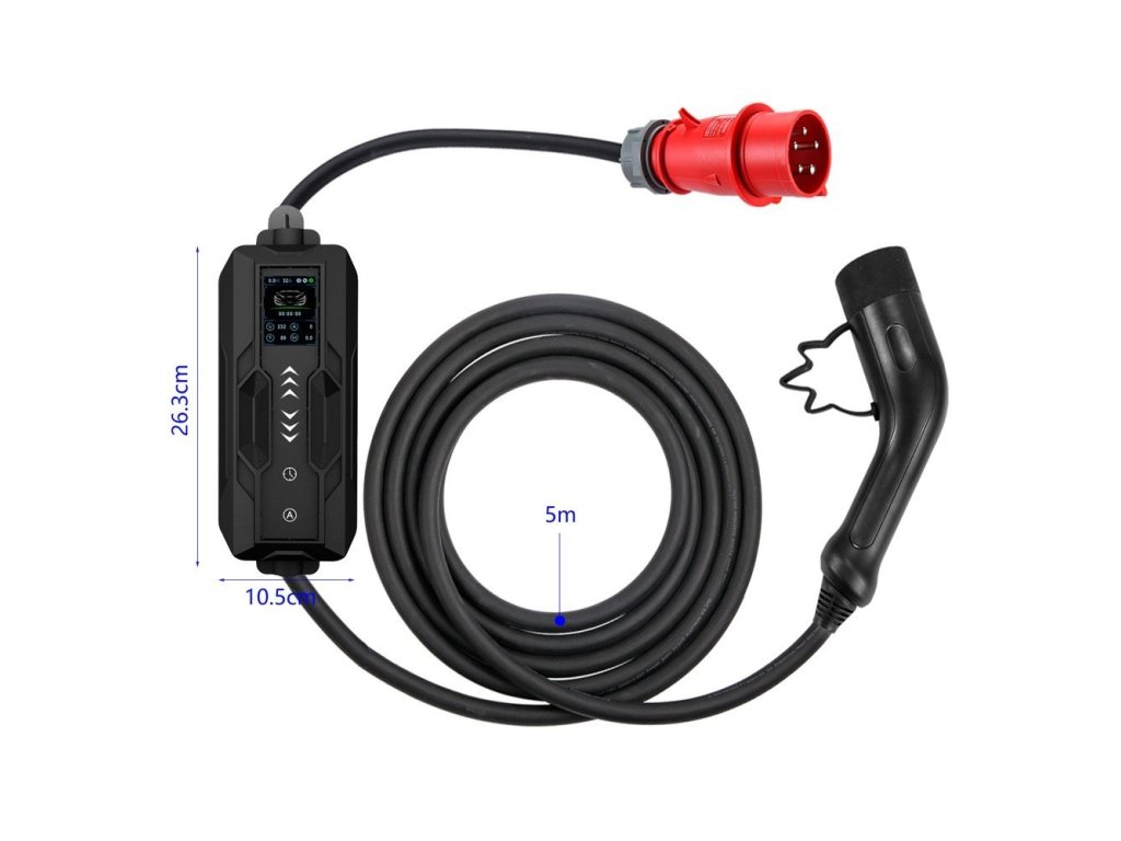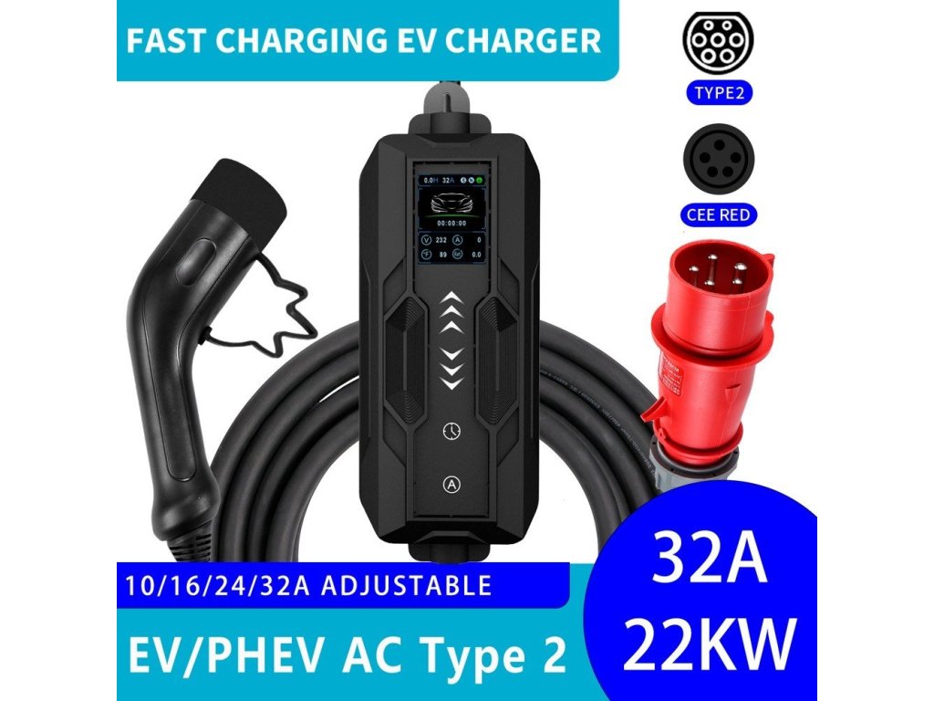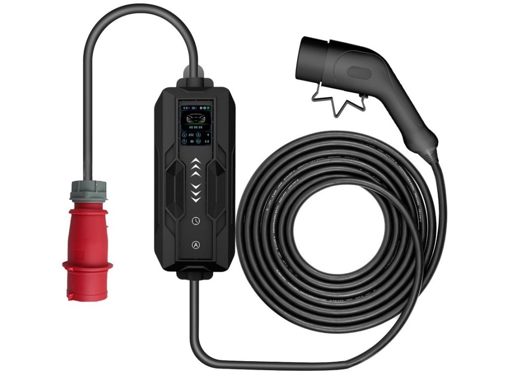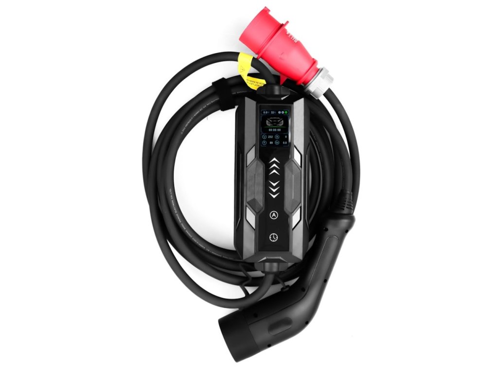 Nabíjecí stanice pro elektromobily – 32A/380V, max. výkon 22kW, 3 fáze, CEE a Typ 2, délka kabelu 5 m, funkce odloženého nabíjení.