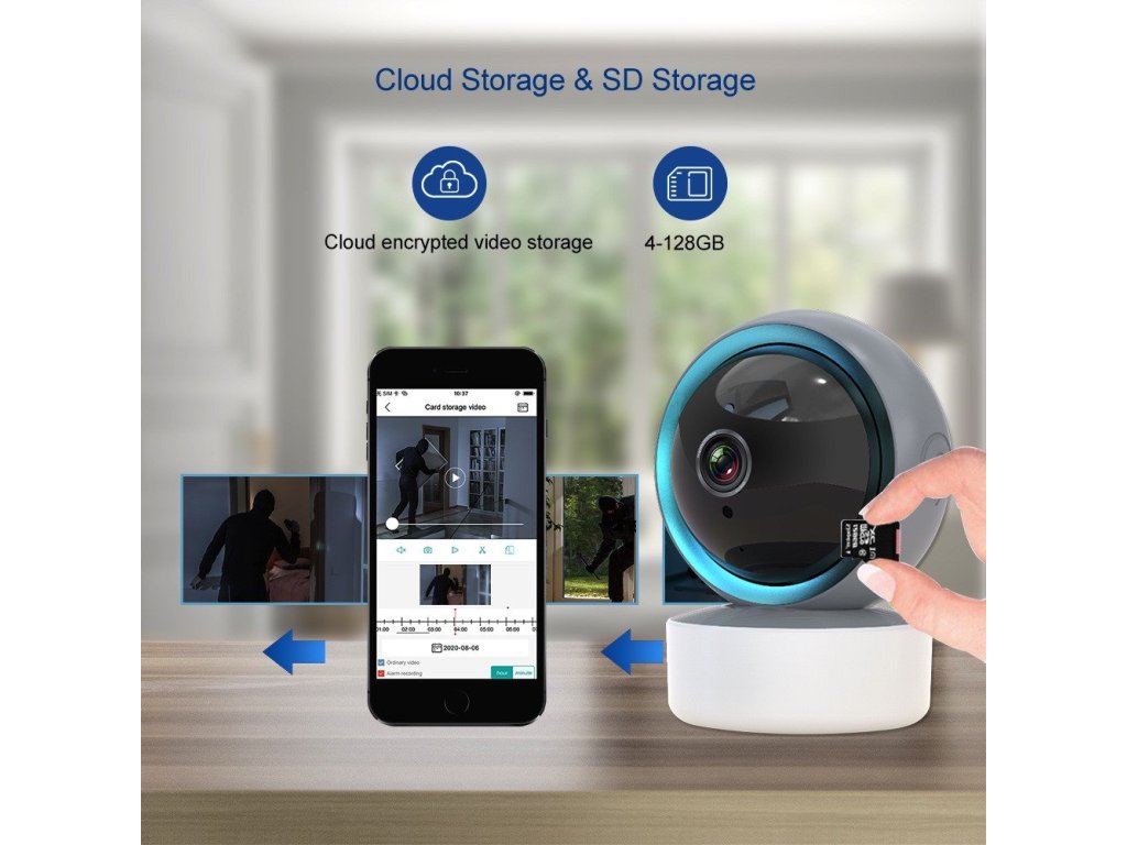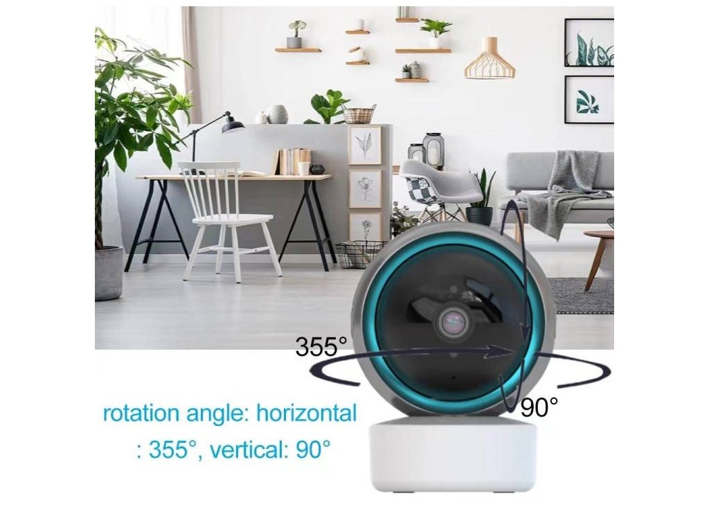 Chytrá vnitřní bezpečnostní kamera s detekcí pohybu disponuje otočným mechanismem pro monitorování v zorném úhlu 360°. Snímač nabízí rozlišení 5 Mpx a je schopný snímat video v rozlišení 2560 × 1920 bodů. Pro případ zhoršených světelných podmínek je přítomen IR přísvit do vzdálenosti až 5 m. Součástí kamery je integrovaný reproduktor a mikrofon, který umožní kvalitní oboustrannou komunikaci. Připojení lze jednoduše realizovat bezdrátově skrze Wi-Fi. Propojení kamery pomocí aplikace v mobilním zařízení umožní pohodlný vzdálený přístup, ovládání kamery, pořizování záznamů či fotografií. Natočené záznamy je možné ukládat i na microSD kartu do kapacity až 128 GB.