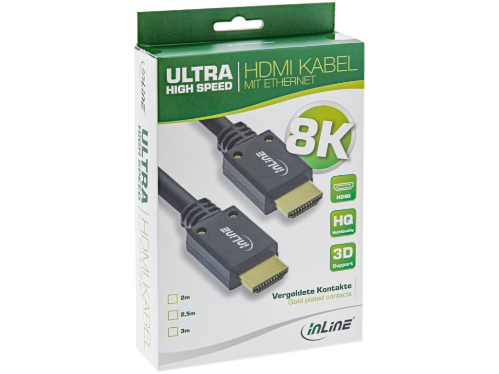 V posledných rokoch sa HDMI stalo štandardom pre prenos obrazu a zvuku. S týmtoInLine kábel HDMI je2 metre dlhý kábel sčierny kabát apozlátené kontakty. Spolu s mimoriadne prepracovaným tienením a medenými vláknami zaručuje vysokú kvalitu signálu.V porovnaní s predchádzajúcimi formátmi táto verzia podporujeRýchlosť prenosu dát až do 48 Gb/s,Rozlíšenie až do 7680 x 4320 @60 Hz aVylepšený spätný zvukový kanál.