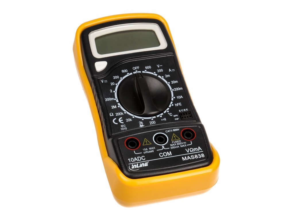 Tento merací prístroj od spoločnosti InLine je digitálny ručný multimeter s 3,5-miestnym displejom na meranie jednosmerného a striedavého napätia, jednosmerného prúdu, odporu, diód, tranzistorov, teploty a skúšky spojitosti.Technické údaje: