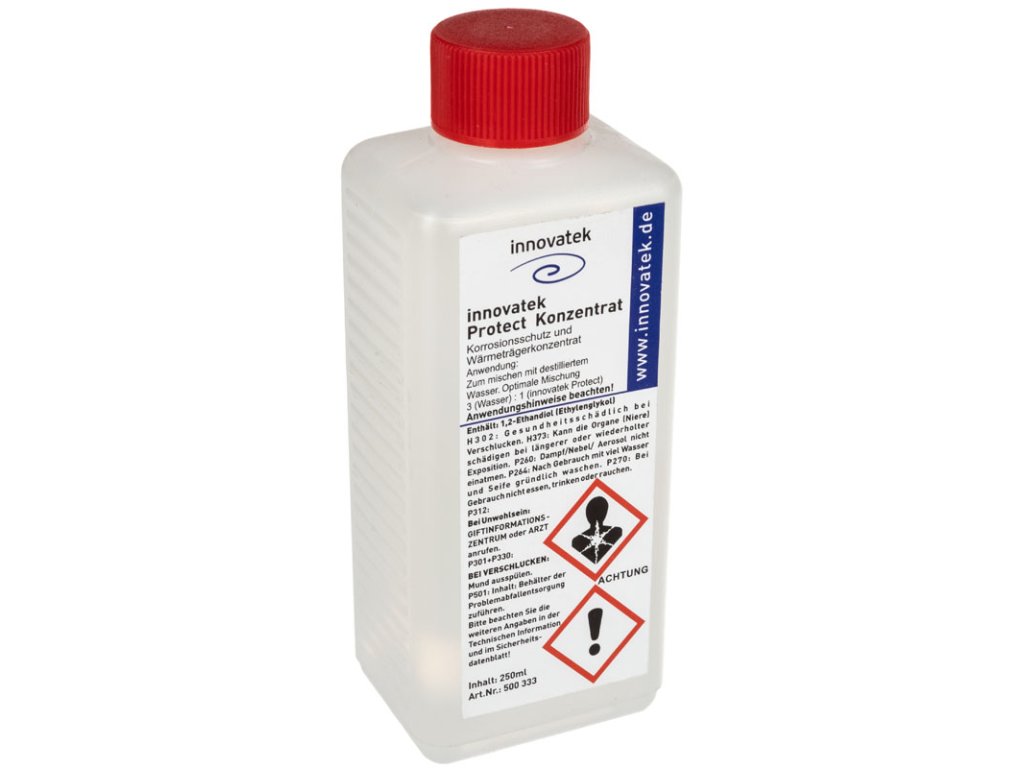 Koncentrát na ochranu proti korózii a teplonosnému médiu innovatek Protect (prvá a jediná prísada na svete špeciálne vyvinutá na tento účel) spoľahlivo chráni vodné chladiace systémy pred koróziou a biologickým znečistením. Prísada je biologicky odbúrateľná, elektricky nevodivá a ľahko sa používa. Protect znižuje povrchové napätie, a tým minimalizuje tvorbu bublín na povrchoch (napr. na chladiči). Obsahuje aj odpeňovač, ktorý spoľahlivo pôsobí proti tvorbe peny a pôsobí ako mazivo pre čerpadlo.Vlastnosti produktu innovatek Protect - IP: