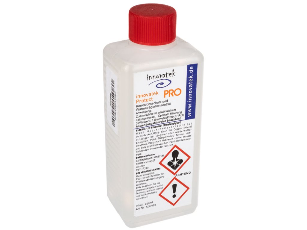 Špeciálny variant (koncentrát) na použitie s bežnou, obyčajnou vodou z vodovodu (zmes 1:3 - veľmi úsporná). S innovatek Protect PRO môžete dosiahnuť rovnaký ochranný účinok a identickú ochranu proti korózii s bežnou vodou z vodovodu ako s kombináciou innovatek Protect a destilovanej vody. Samozrejme, innovatek Protect PRO sa môže používať aj s destilovanou vodou.