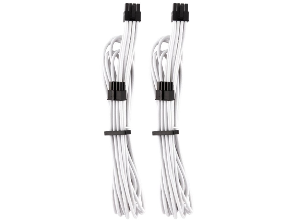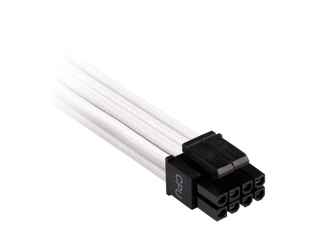 Táto súprava sa skladá zdva káble EPS12V/ATX12V s plášťomktorébez nevzhľadných teplom zmršťovaných hadičiek boli pripojené k zástrčkám. Pre čo najlepší vzhľad je každý káblový zväzok samostatne pokrytý nepriehľadným a pevným opleteným plášťom zvysokokvalitný materiál paracord v bielej farbe rukávy. Spojenia sú vyhotovené v čiernej farbe, ktorá vytvára elegantný kontrast a štýlový dizajn.Na vyrovnanie napätia 12-voltovej lišty sú káble pripojené pomocoudodatočne integrované kondenzátory vybavené. Káble sú kompatibilné s napájacími jednotkami Corsair typu 4 a dosahujúmaximálna bezpečnosťpri pripájaní napájacej jednotky k iným hardvérovým komponentom. Dva káblové hrebene s 8 drážkami sú predinštalované a uľahčujú dokonale zarovnané vodiče a čistý dizajn káblov.