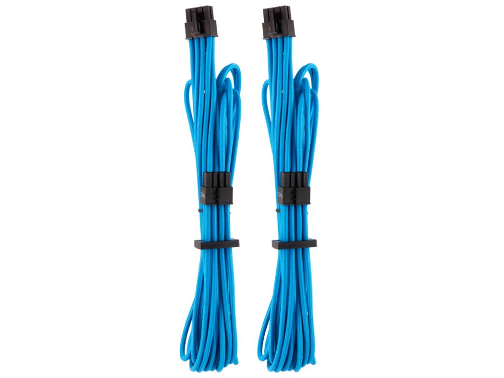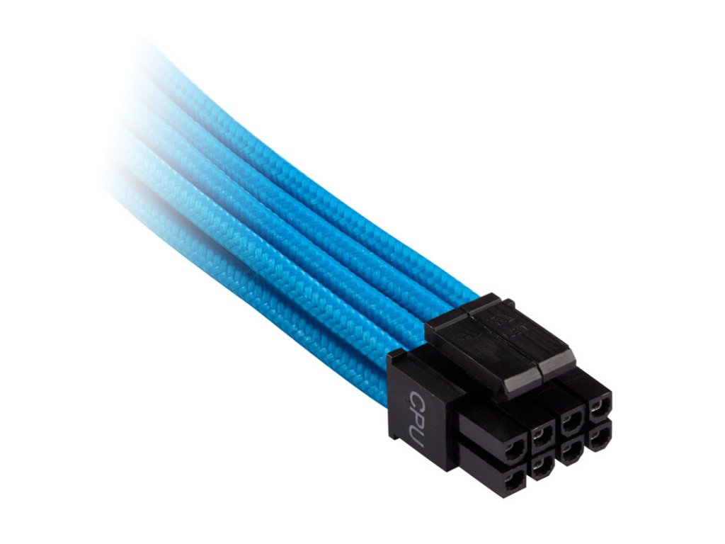 Táto súprava sa skladá zdva káble EPS12V/ATX12V s plášťomktorébez nevzhľadných teplom zmršťovaných hadičiek boli pripojené k zástrčkám. Pre čo najlepší vzhľad je každý káblový zväzok samostatne pokrytý nepriehľadným a pevným opleteným plášťom zvysokokvalitný materiál paracord v modrej farbe rukávy. Spojenia sú vyhotovené v čiernej farbe, ktorá vytvára elegantný kontrast a štýlový dizajn.Na vyrovnanie napätia 12-voltovej lišty sú káble pripojené pomocoudodatočne integrované kondenzátory vybavené. Káble sú kompatibilné s napájacími jednotkami Corsair typu 4 a dosahujúmaximálna bezpečnosťpri pripájaní napájacej jednotky k iným hardvérovým komponentom. Dva káblové hrebene s 8 drážkami sú predinštalované a uľahčujú dokonale zarovnané vodiče a čistý dizajn káblov.