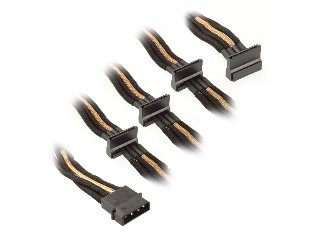 Ide o 4-kolíkový napájací kábel Molex na 4x SATA s čiernymi čiastočne zlatými objímkami a čiernymi zástrčkami. Prepája 4-kolíkovú zástrčku Molex (napájací zdroj) so štyrmi (!) napájacími zásuvkami SATA (disky). Aby sa dosiahol požadovaný optický efekt, 1. normálny kábel Molex by mal byť skrytý a 2. ostatné káble v skrinke by mali byť nahradené príslušnými verziami Silverston v rovnakej farbe.