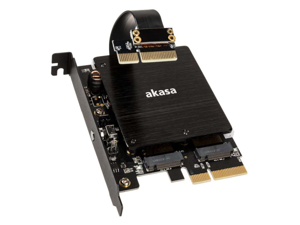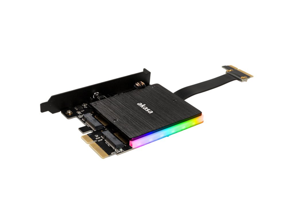 StránkaDuálna karta adaptéra M.2 PCI-E RGB LED z adresyAkasa umožňuje prevádzku dvoch diskov M.2 SSD prostredníctvom dvoch slotov PCie x4. Zásuvná karta má dva sloty M.2, oba sú pripojené cez PCI Express so štyrmi linkami a môžu byť použité na prevádzkuDisky SSD NVMe sú určené.Stránkadva sloty M.2 umožniť inštaláciusSD disky s dĺžkou do 80 milimetrov (2280). Tie sa vložia do pripravených otvorov a priskrutkujú sa. Potom sa na ne nasadia dodané tepelné podložky a na vrch sa umiestni chladič. Ten zabezpečuje pasívne chladenie pamäťových čipov a je vybavenýRGB LED osvetlenie vybavené.