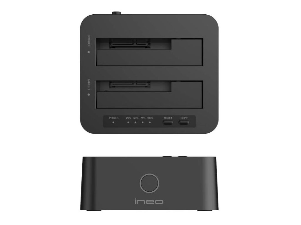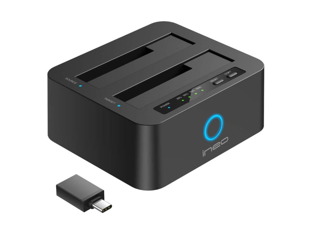 Dokovacia a klonovacia stanica INEO má niekoľko užitočných funkcií. Na jednej strane môžete vytvárať kópie HDD a SSD, ale aj prenášať veľké množstvo súborov z počítača alebo notebooku na dva pevné disky súčasne.