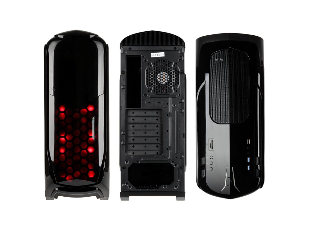Vonkajšie zakrivená predná časť plynule prechádza do veka a LED pásik umiestnený v "čele" veže tento prechod šikovne zvýrazňuje. Na každej strane veka, ktoré je tiež zakrivené, sú dve okienka LED a ďalšie dva svetlomodro podsvietené pásiky lemujú tlačidlo napájania v strede.Dvojdielny panel I/O obsahujedva porty USB 3.0, dva audio porty aPort USB 2.0 na pravej strane veka aČítačka kariet (pre karty SD a TF) a ovládacie prvkyintegrované ovládanie ventilátora na ľavej strane. Zadnú časť veka zaberá sieťová mriežka a samotné veko je na 3/4 dĺžky orámované výklenkami.