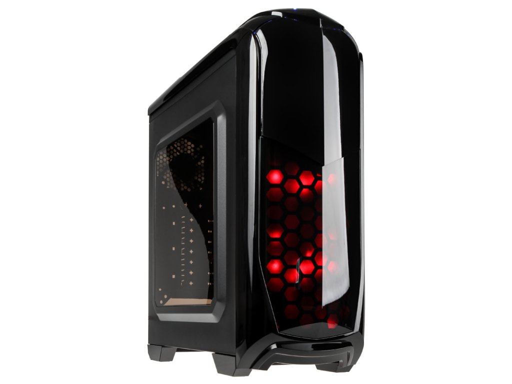 Rovnako ako mnohé iné skrinky Kolink, aj Aviator má na bočných paneloch vypukliny, ktoré zväčšujú objem veže. Veľký,tónované akrylové bočné okno vo výduchu na ľavej strane poskytuje pohľad na nainštalované komponenty, ale skutočným lákadlom skrine je predná časť a veko.Dve stránkypredinštalovaný 120 mm ventilátor s červenou LED diódou osvetľujú sieťový povrch v tvare včelieho plástu, ktorý sa nachádza za navonok zakriveným akrylovým krytom. Toto okno prechádza do lesklej čiernej klapky, za ktorou sa ukrývajú panely pre dva 5,25-palcové a jeden externý 3,5-palcový disk.