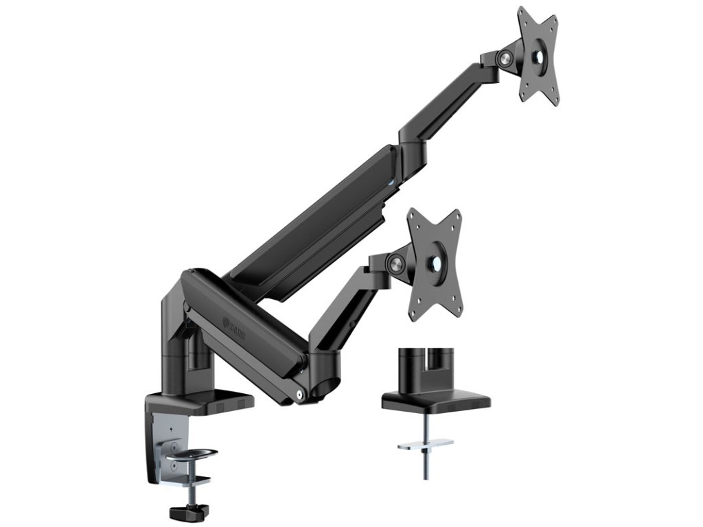 CelkovoRamená držiaka monitora s plynovými vzperami ľahko sa predĺži až na dĺžku 440 mm. Stabilitu zabezpečuje aj niekoľko možností uzamknutia. Vďaka početným kĺbom môžu ramenávyrobené z práškovo lakovaného hliníka a monitory k nemu pripojené sa môžu otáčať takmer rovnobežne s okrajom stola, napríklad ak je za ním stena. Arozsiahle vedenie káblov zabezpečuje, aby sa tieto údaje dali jednoducho a čisto viesť z monitorov do počítača.