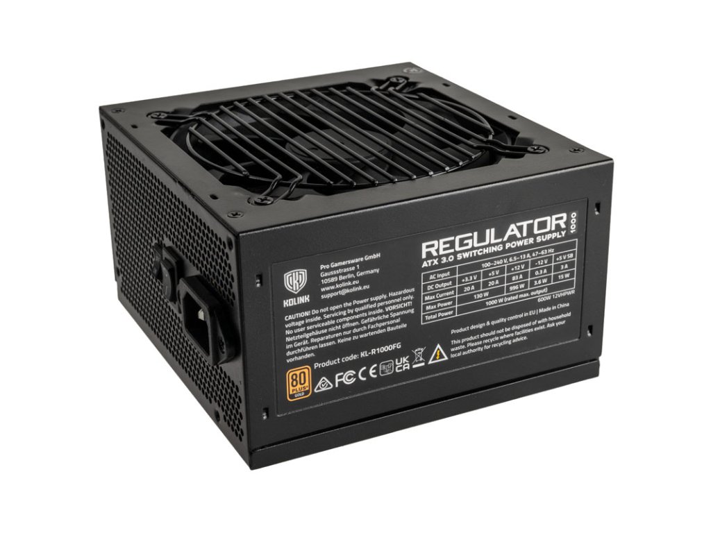 SSéria regulátorov predstavujeKolink výkonné napájacie zdroje s certifikáciou 80 PLUS Gold. Vysokokvalitné komponenty, pokročilý dizajn a výkonný 12 V single rail zaručujú stabilné napájanie a presnú reguláciu napätia. V súlade so štandardom ATX 3.0Regulátor 80 PLUS Gold 1000W pripojenie PCIe 5.0 12VHPWR pre grafické karty radu NVIDIA RTX 4000. Celkové balenie dopĺňa plne modulárny manažment káblov a tichý 120 mm ventilátor.Napájací zdroj Kolink Regulator 80 PLUS Gold s výkonom 1 000 wattov v detailoch
