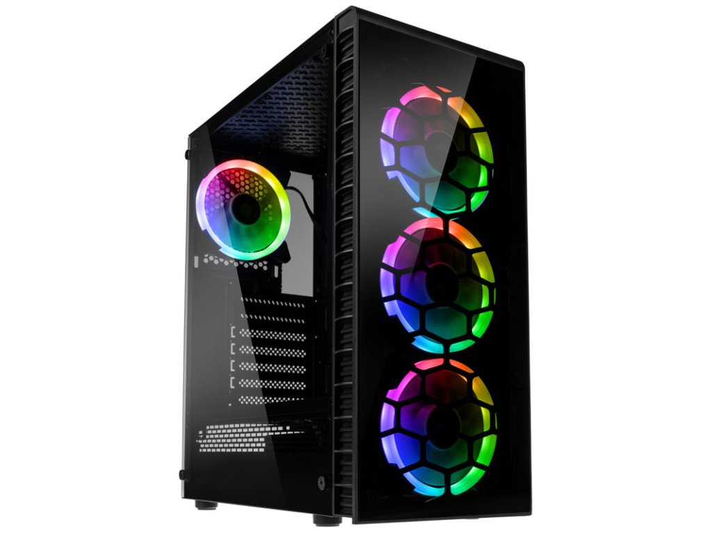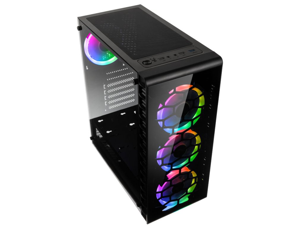 - Predná časť z tvrdeného skla s tromi predinštalovanými 120 mm ventilátormi ARGB