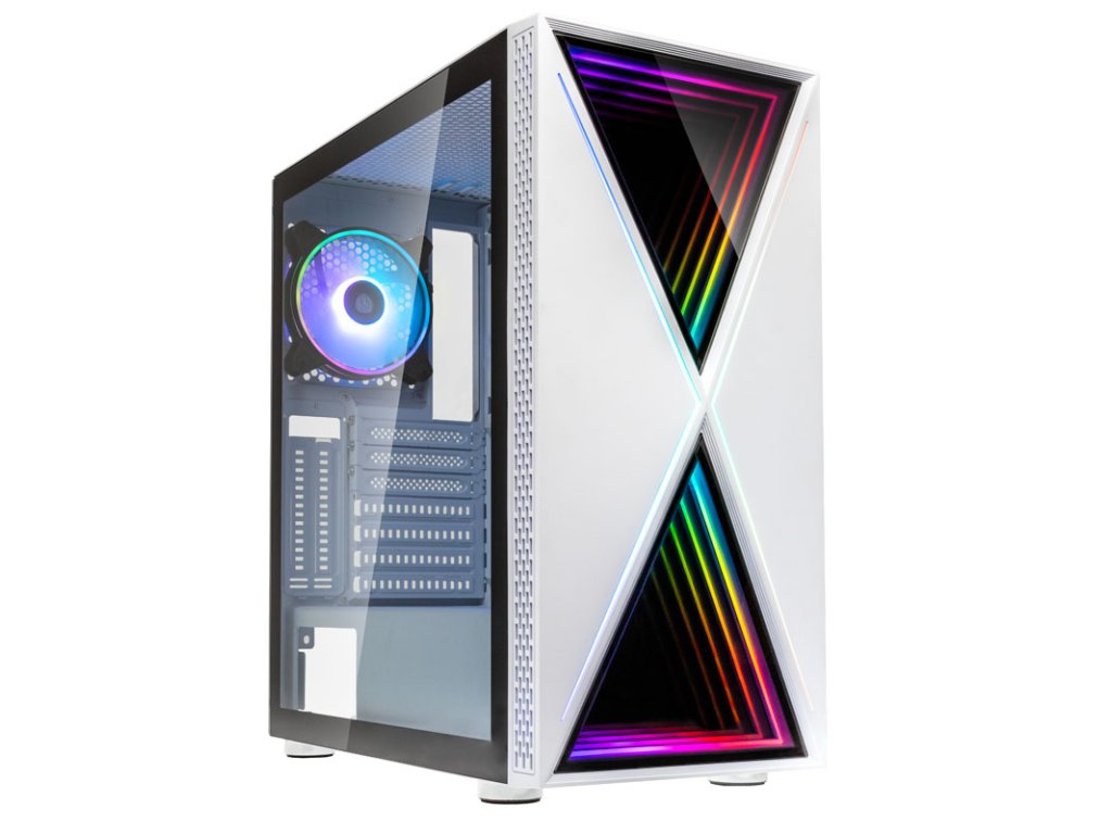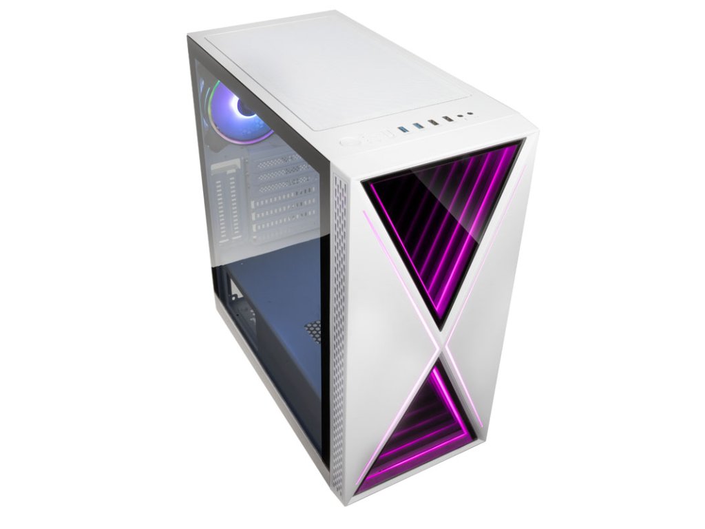 VKolink Void X v atraktívnej bielej farbeMidi veže sa hodíZákladná doska E-ATX a na prednej strane je vyobrazenýnápadný X s efektom nekonečného zrkadlaktorá sa vyznačujePásy zvýraznené digitálne adresovateľnými RGB LED diódami sa stáva. Okrem tohto pôsobivého estetického vylepšeniaKolink Void X ponúka aj pôsobivú hardvérovú podporu. Napríklad grafické karty možno inštalovať aj vertikálne ak dispozícii je priestor pre dva radiátory.