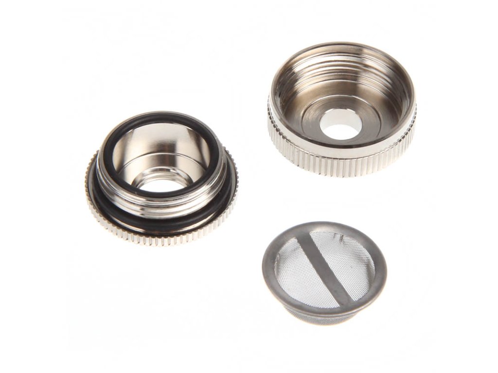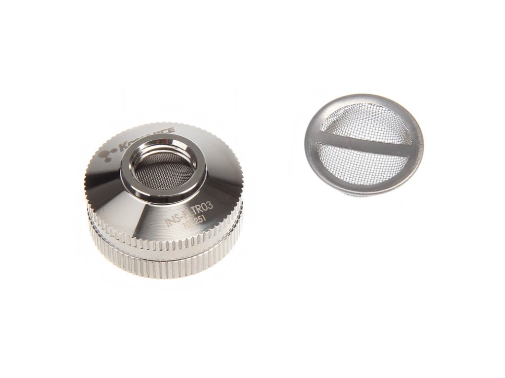 Filter je vyrobený zo striebornej poniklovanej mosadze a akrylu v strede, samotná sieťka filtra je vyrobená z nehrdzavejúcej ocele. Pripojenia sú so závitom G1/4 samec a G1/4 samica.