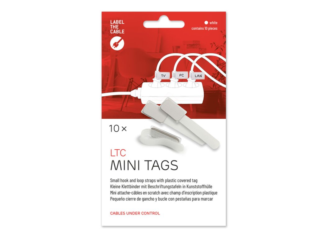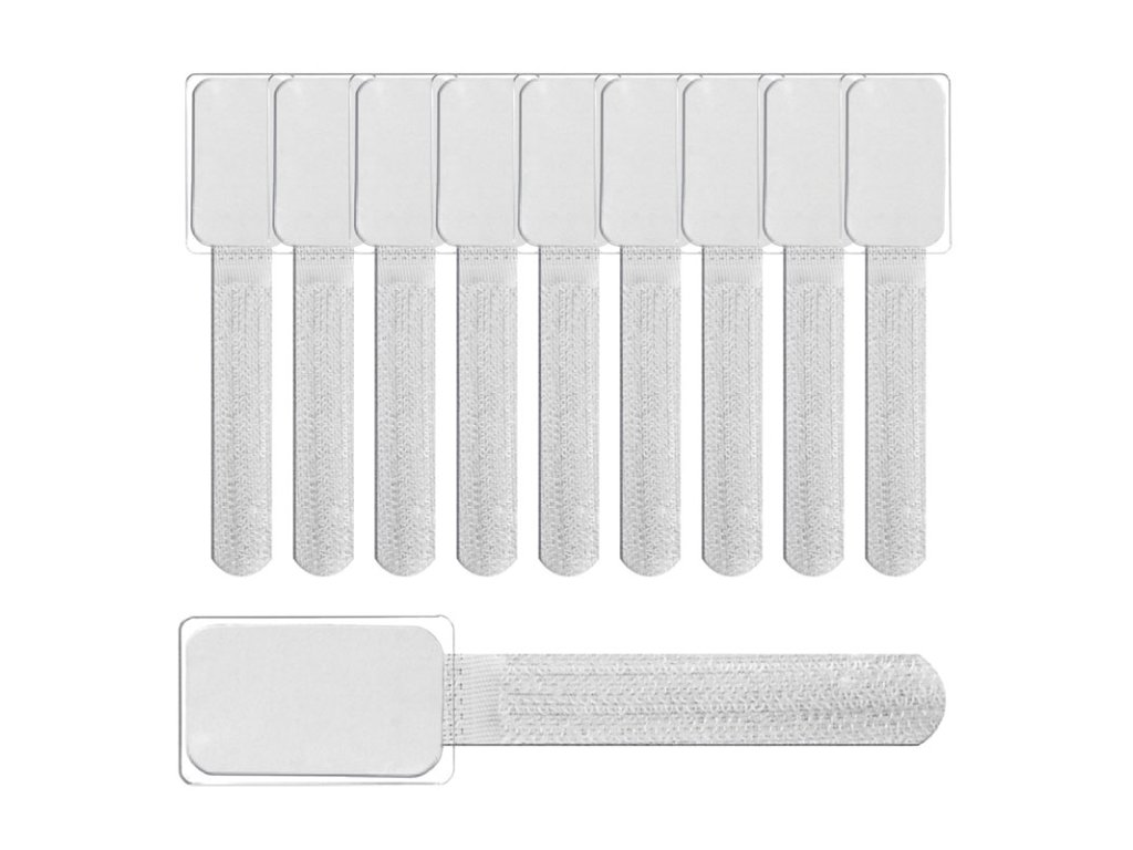 Toto je sada desiatich bielych mini káblových viazačov s háčikom a slučkou. Táto menšia verzia je vhodná najmä na označovanie jednotlivých káblov a zástrčiek, ako aj na zväzovanie tenších káblov, napríklad slúchadiel alebo napájacích jednotiek. Šírka je variabilná vďaka technológii suchého zipsu a je spoľahlivá aj po mnohých procesoch otvárania a zatvárania. Štítky na označovanie sú chránené plastovým puzdrom.