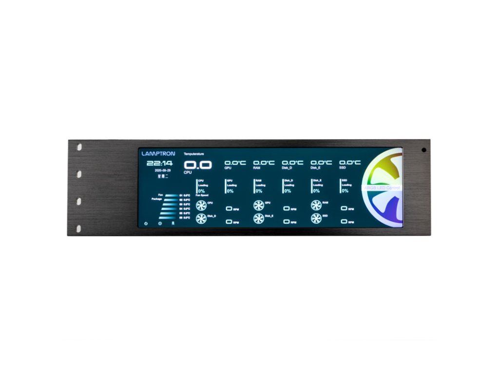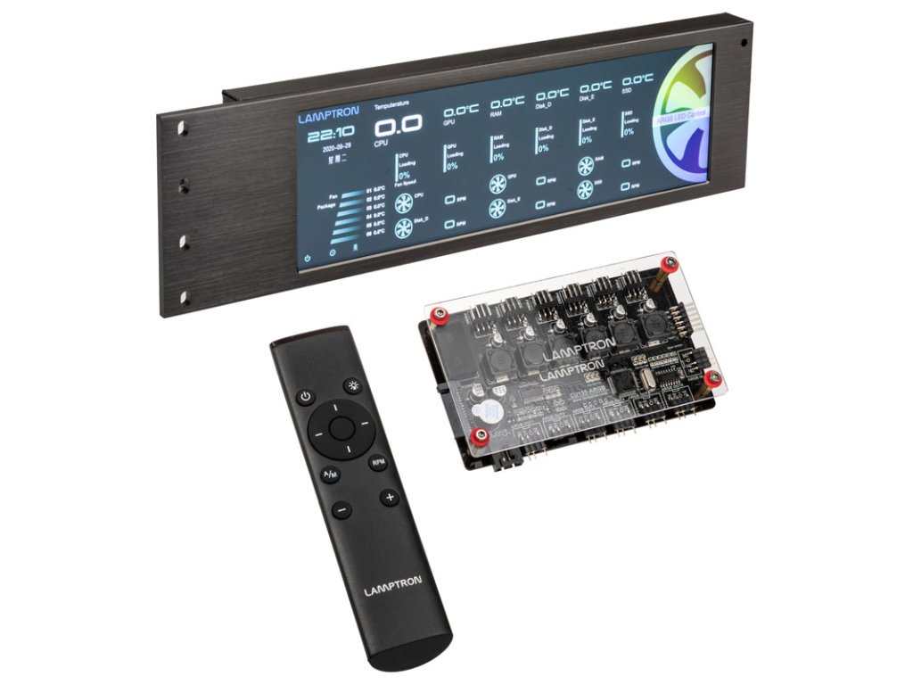 Otáčky ventilátora sa ovládajú pomocouuzavreté diaľkové ovládanie. Režimy osvetlenia sa nastavujú aj pomocou diaľkového ovládania. StránkaLamptron CU135 možno pripojiť k základnej doske alebo inému RGB ovládaču pomocou priloženého kábla, čím sa umožníSynchronizácia osvetlenia RGB a ARGB s externými riadiacimi jednotkami.Aby ste vedeli aj to, ako rýchlo sa ventilátory otáčajú, pri akom napätí práve bežia a aké teploty prevládajú vo vnútri krytu, spoločnosť Lamptron pridalaštýlový displej LC obsahuje. Je pripojený k štyrom voľným slotom PCI a výstup možno obdivovať cez priehľadné bočné okno. Riadiaca doska je k nemu pripojená káblom a môže byť ukrytá niekde v skrinke.