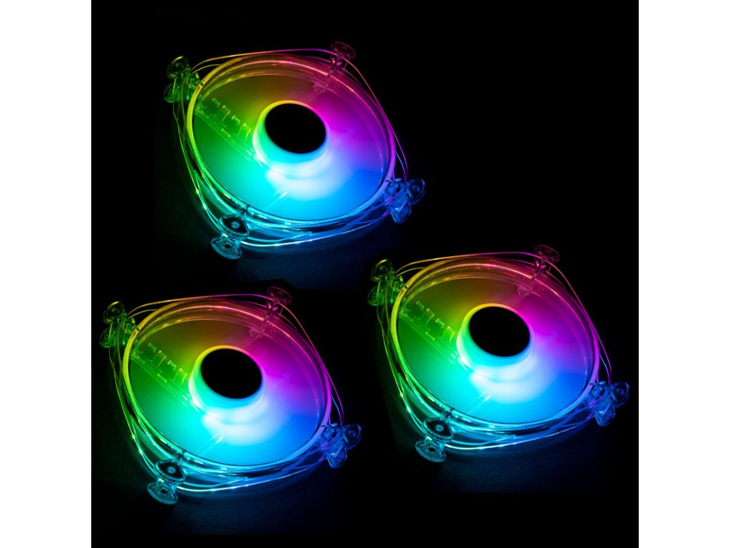 SIcecloud+ ARGB ponukyLamptron jeden120 mm ventilátor PWM sadresovateľné osvetlenie RGB LED na. Táto praktická súprava obsahujetri z týchto ventilátorov obsahuje. LED diódy sú integrované do osi ventilátora a umožňujú priehľadnému rámu a lopatkám ventilátora z mliečneho plastu svietiť štýlovými farbami.Prehľad vlastností súpravy Lamptron Icecloud+ ARGB so 120 mm trojitým ventilátorom: