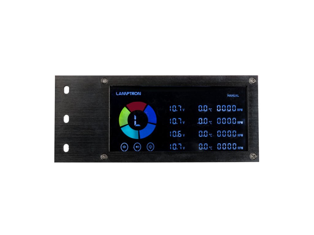 Osvetlenie a otáčky ventilátora sa ovládajú pomocouinfračervené diaľkové ovládanie je súčasťou balenia. Ventilátory možno napríklad nastaviť na tichý režim na 40 % alebo na maximálny režim. Alebo môžete ponechať ovládanie ventilátorov na regulátore. Režimy osvetlenia sa tiež nastavujú prostredníctvom diaľkového ovládača.Aby ste vedeli aj to, ako rýchlo sa ventilátory otáčajú, pri akom napätí práve bežia a aké teploty prevládajú vo vnútri krytu, spoločnosť Lamptron pridalaštýlový displej LC obsahuje. Je pripojený k trom voľným slotom PCI a výstup možno obdivovať cez priehľadné bočné okno. Riadiaca doska je k nemu pripojená káblom a môže byť ukrytá niekde v skrinke.